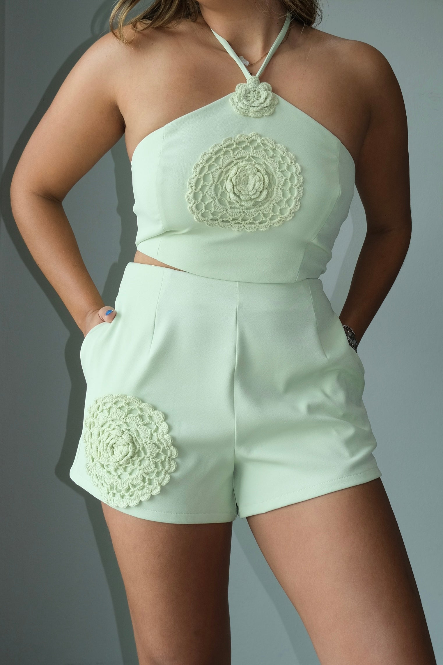 The Beth Crochet Details Halter Top & Short Set is perfect for any summer outing. Made with 95% polyester and 5% spandex, this set offers comfort and style. The smocked back of the top and invisible zipper on the shorts ensure a perfect fit. Plus, it runs true to size, as modeled in a size small.