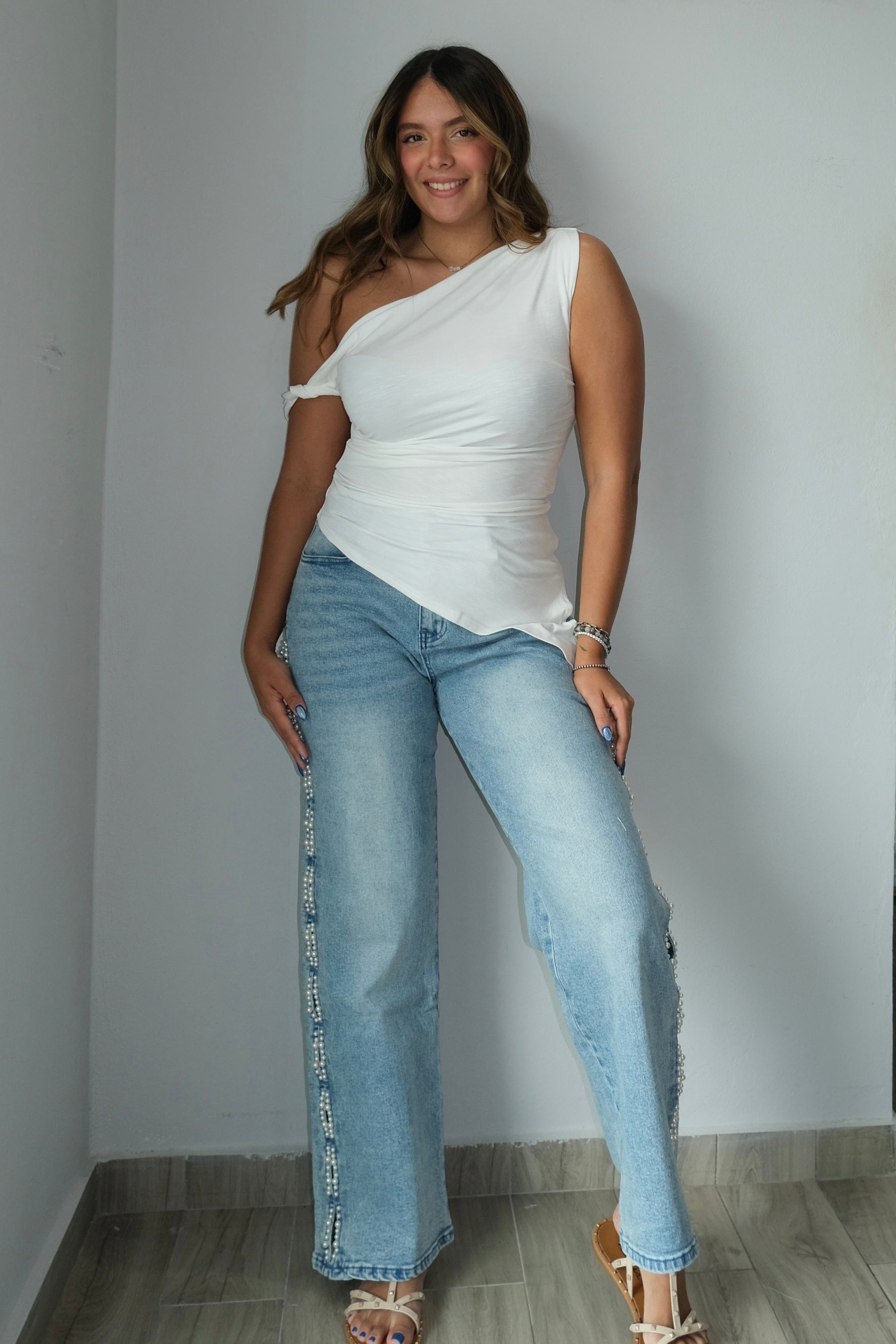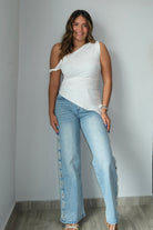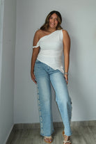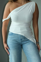 This one shoulder top, made of VERY stretchy fabric, fits true to size and is modeled in a small. Perfect for any size, this asymmetrical top adds unique flair to any outfit.