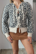 Margot Front Tie Animal Print Cardigan Wrap yourself in cozy comfort with this fuzzy animal print cardigan. The front tie detail adds a charming touch, while the soft texture keeps you warm and snug. True to size for the perfect fit—our model wears a small. Perfect for layering over your favorite outfits.