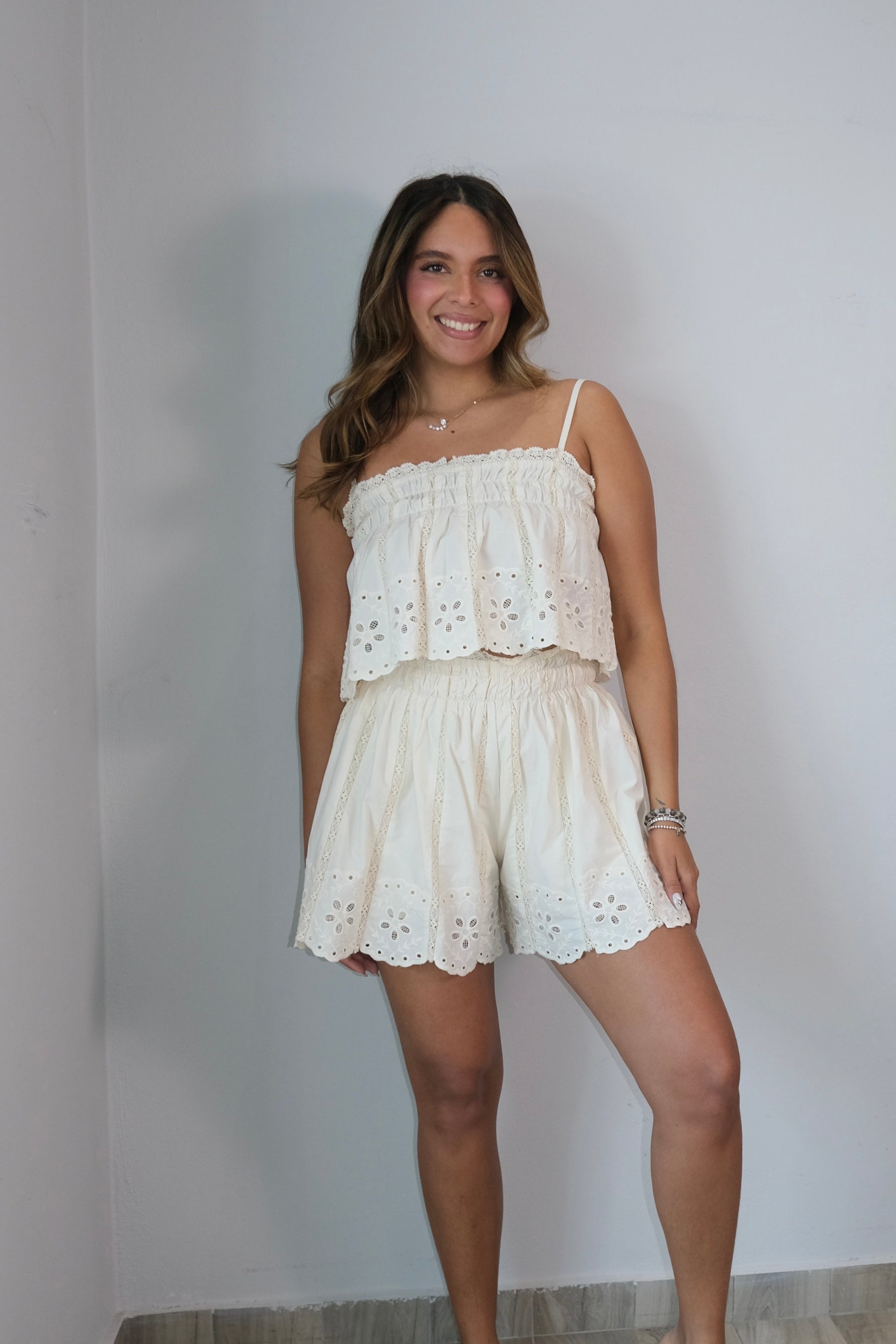 Myra Embroidered Lace Cami & Short Set features delicate lace detailing with a comfortable spandex blend that moves with you. The set runs true to size, so order your regular size for the perfect fit. Our model wears a small. This two-piece set combines feminine style with everyday wearability, making it an easy addition to your loungewear collection.