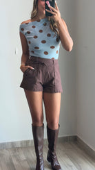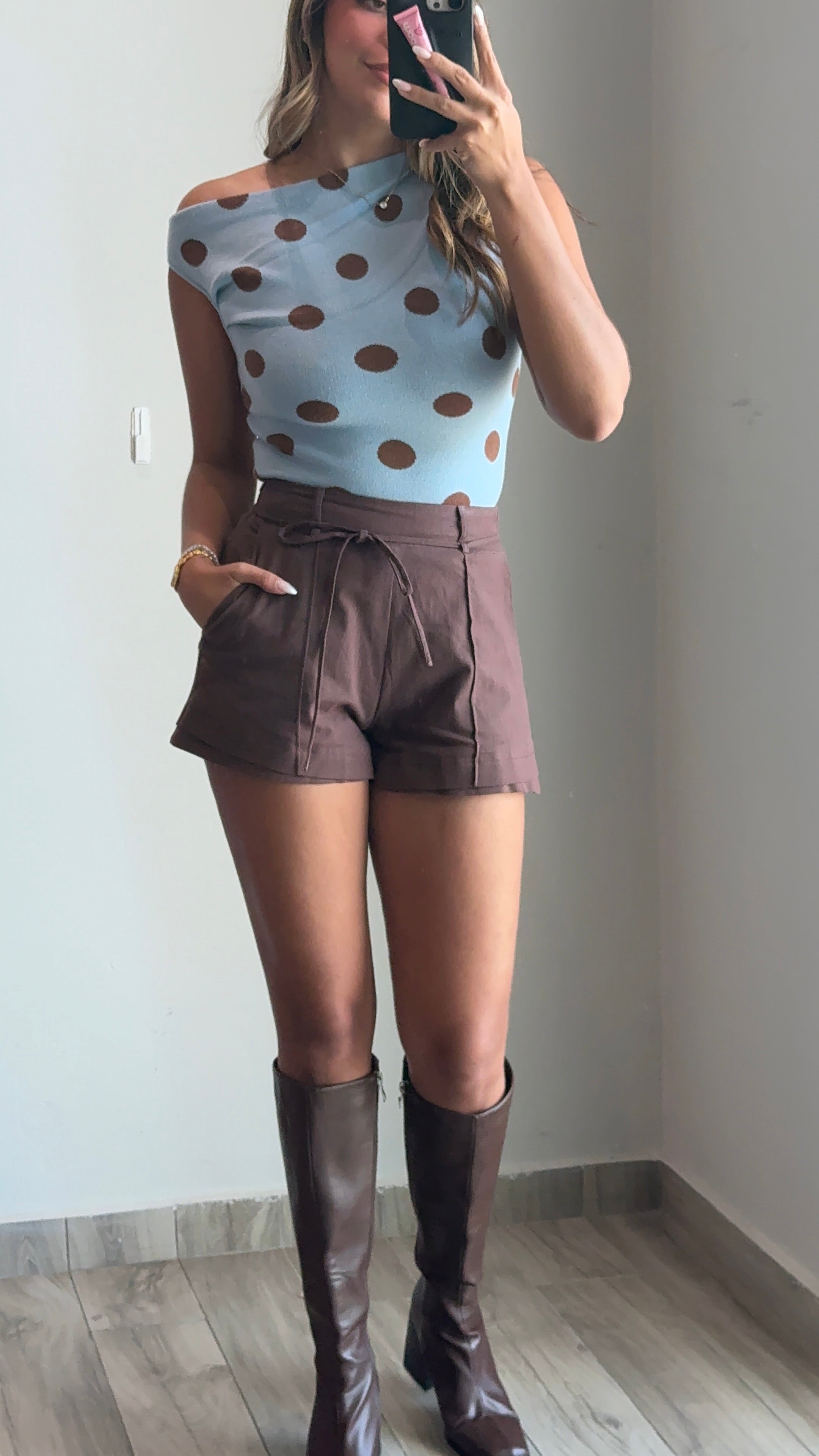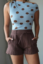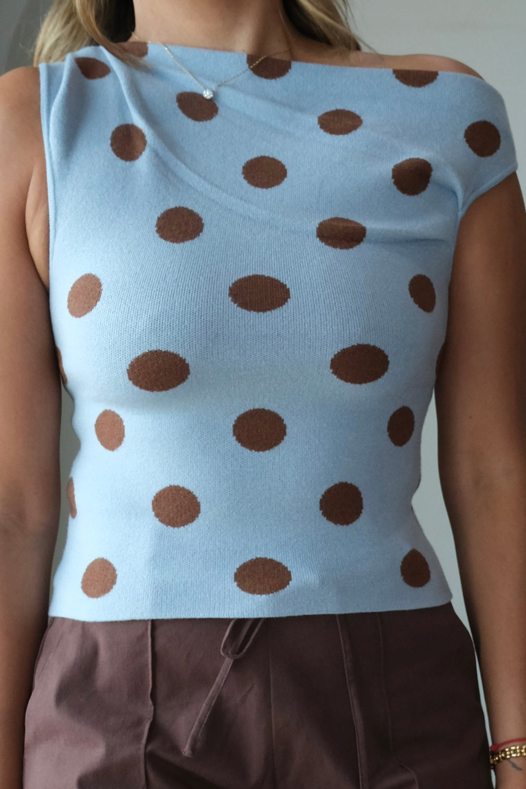 The Anna Knit Polka Dot Asymmetrical Top features a playful polka dot pattern with an asymmetrical cut for a modern look. Made from stretchy knit fabric, it moves with you for all-day comfort. This top runs true to size, so order your regular size. The model is wearing a xsmall.