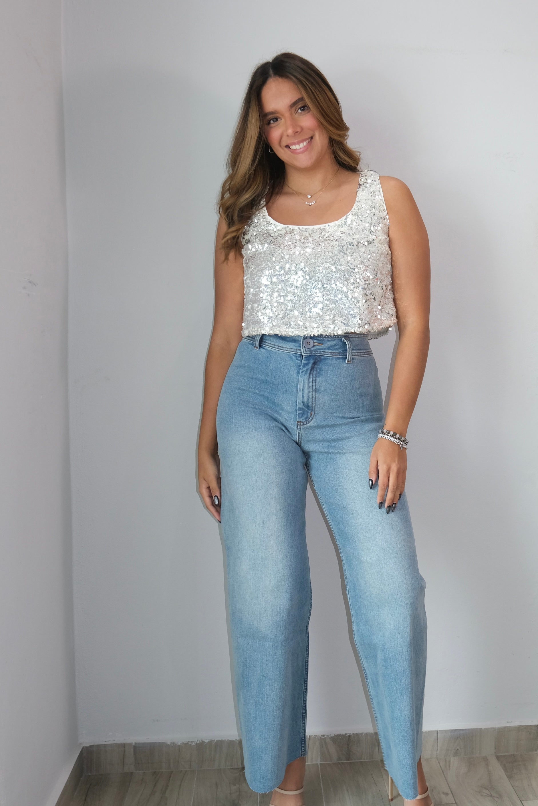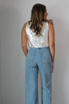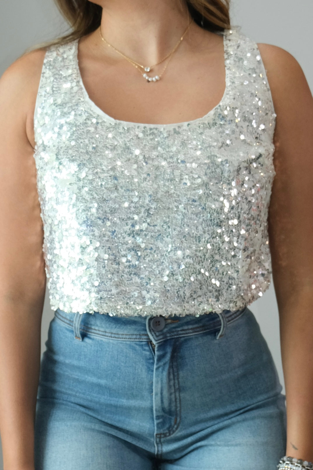 Celeste Silver Sequins Top features shimmering sequins that catch the light beautifully. This top runs true to size and maintains its shape without stretching, so you can count on a consistent fit wash after wash. The model pictured is wearing a size small. Perfect for adding sparkle to your wardrobe for special occasions or nights out.