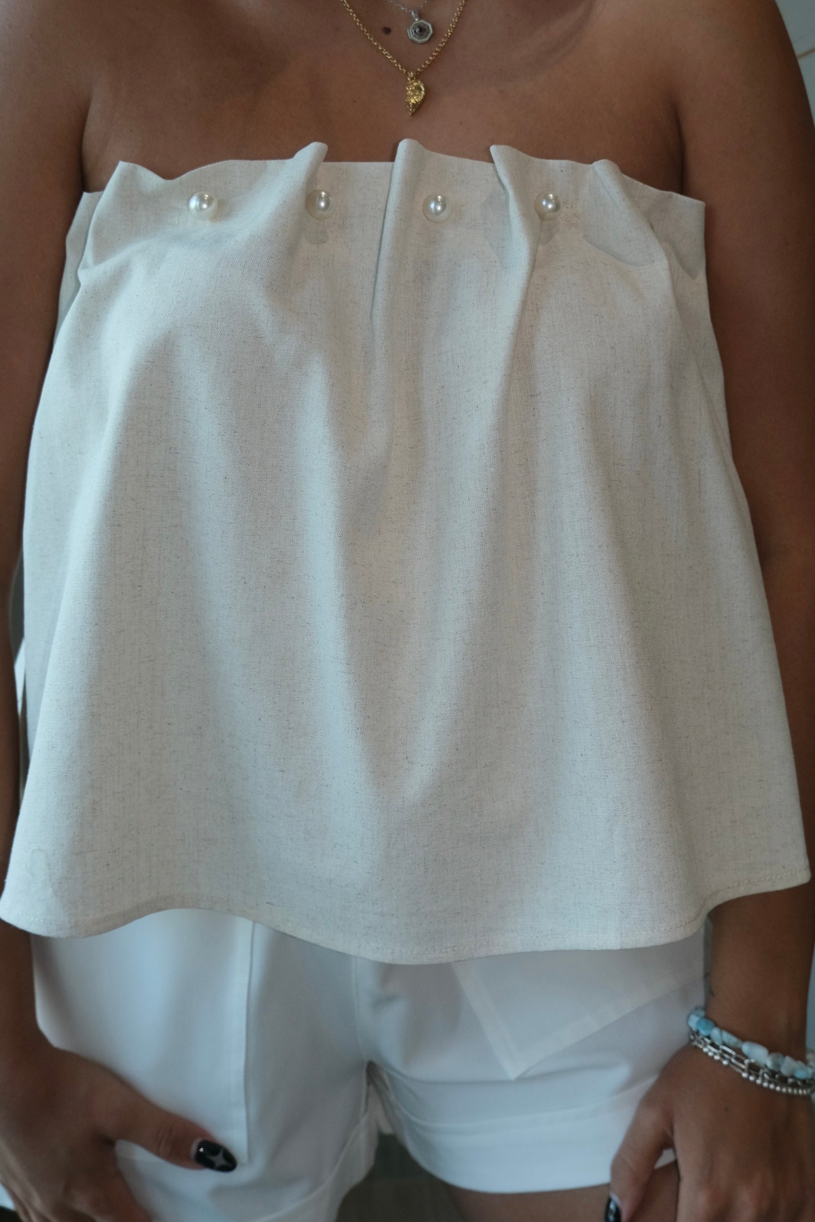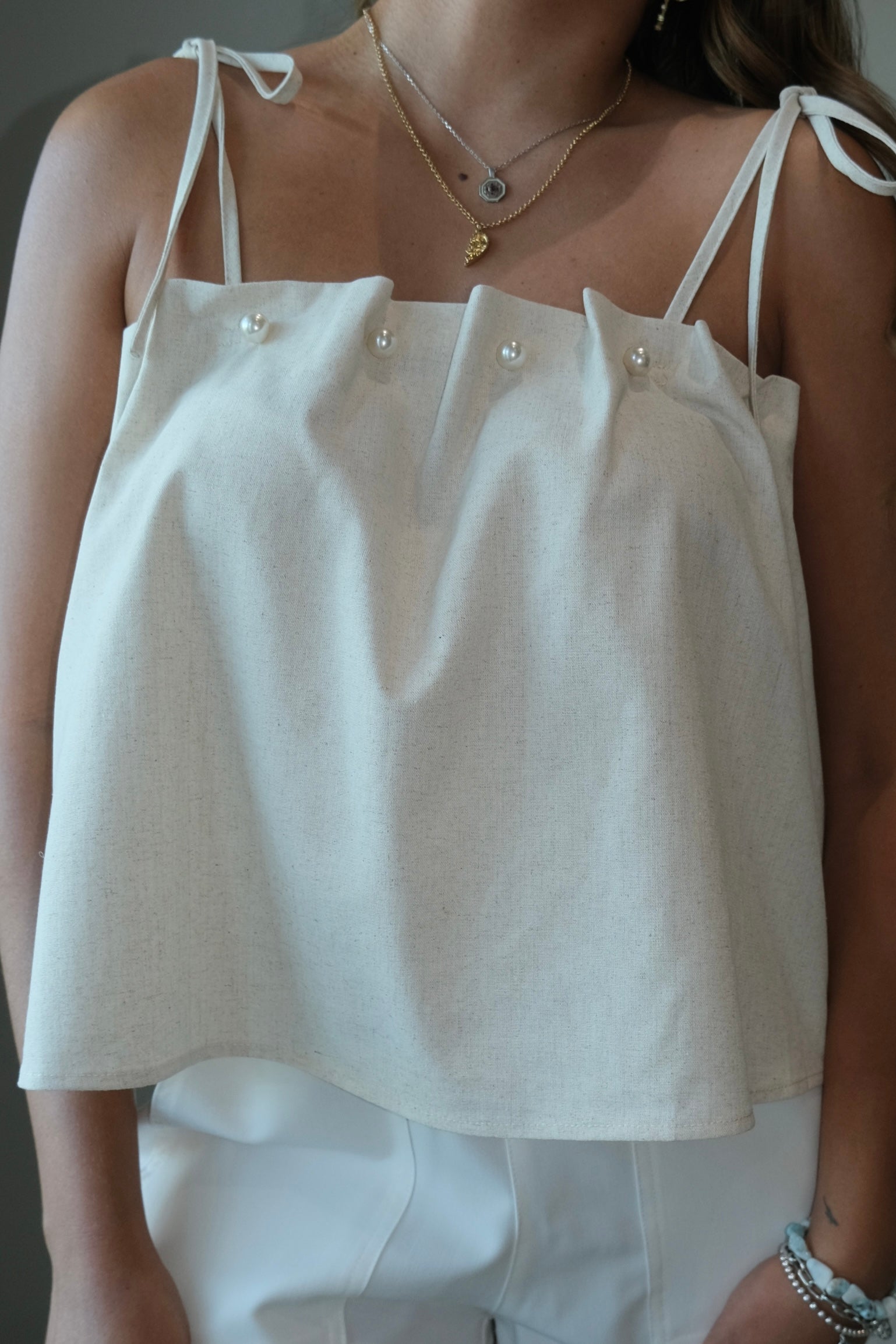Romee Pearl Embellished Linen Top