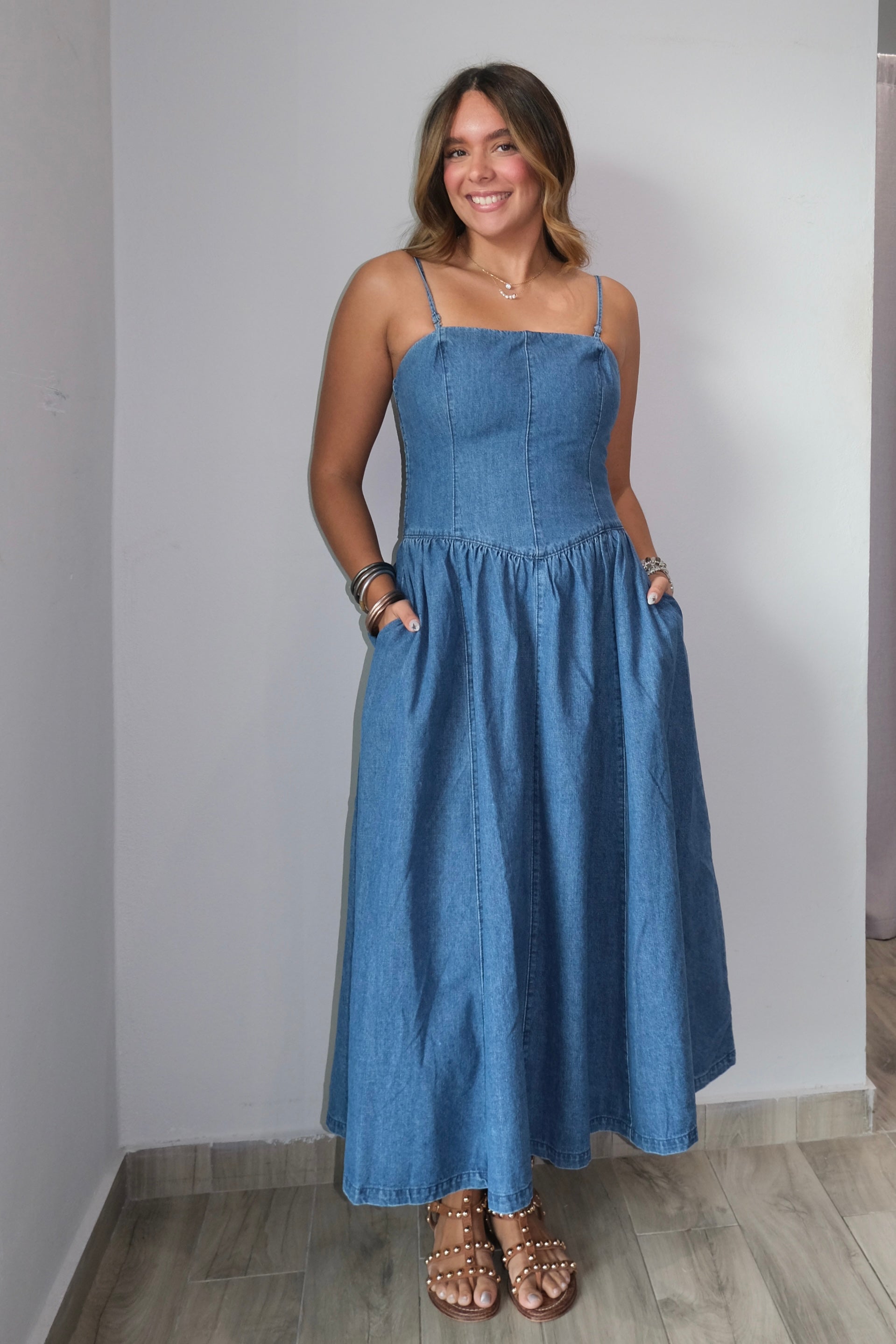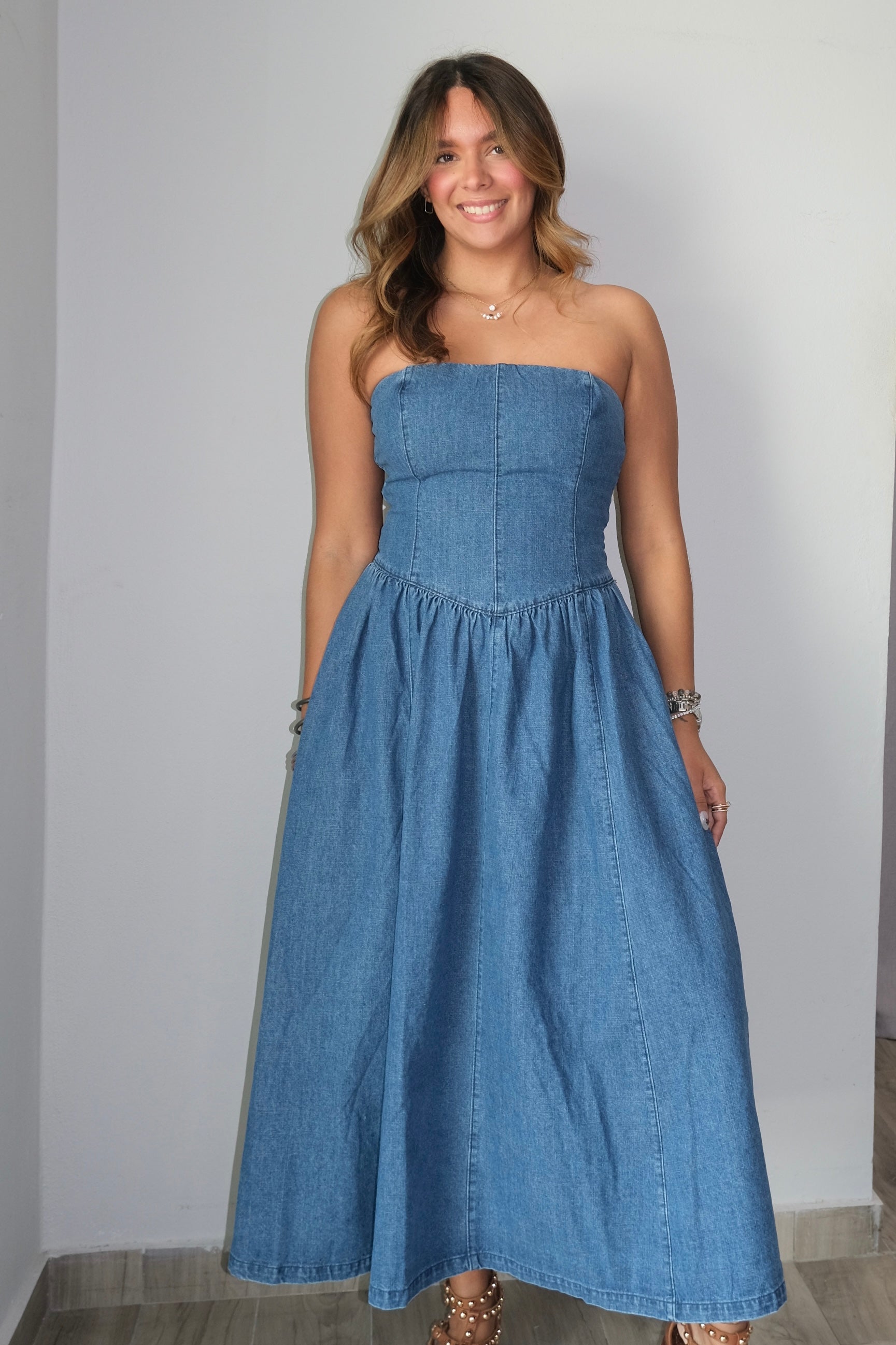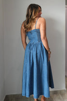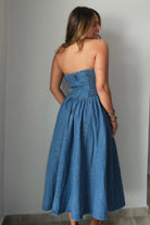 Victoria Smocked Denim Midi Dress Crafted from 100% cotton, this midi dress features a flattering smocked bodice that hugs your curves beautifully. The versatile design works strapless or with straps, giving you multiple styling options for any occasion. True to size fit, with our model wearing a small. Perfect for warm weather dressing with timeless denim appeal.