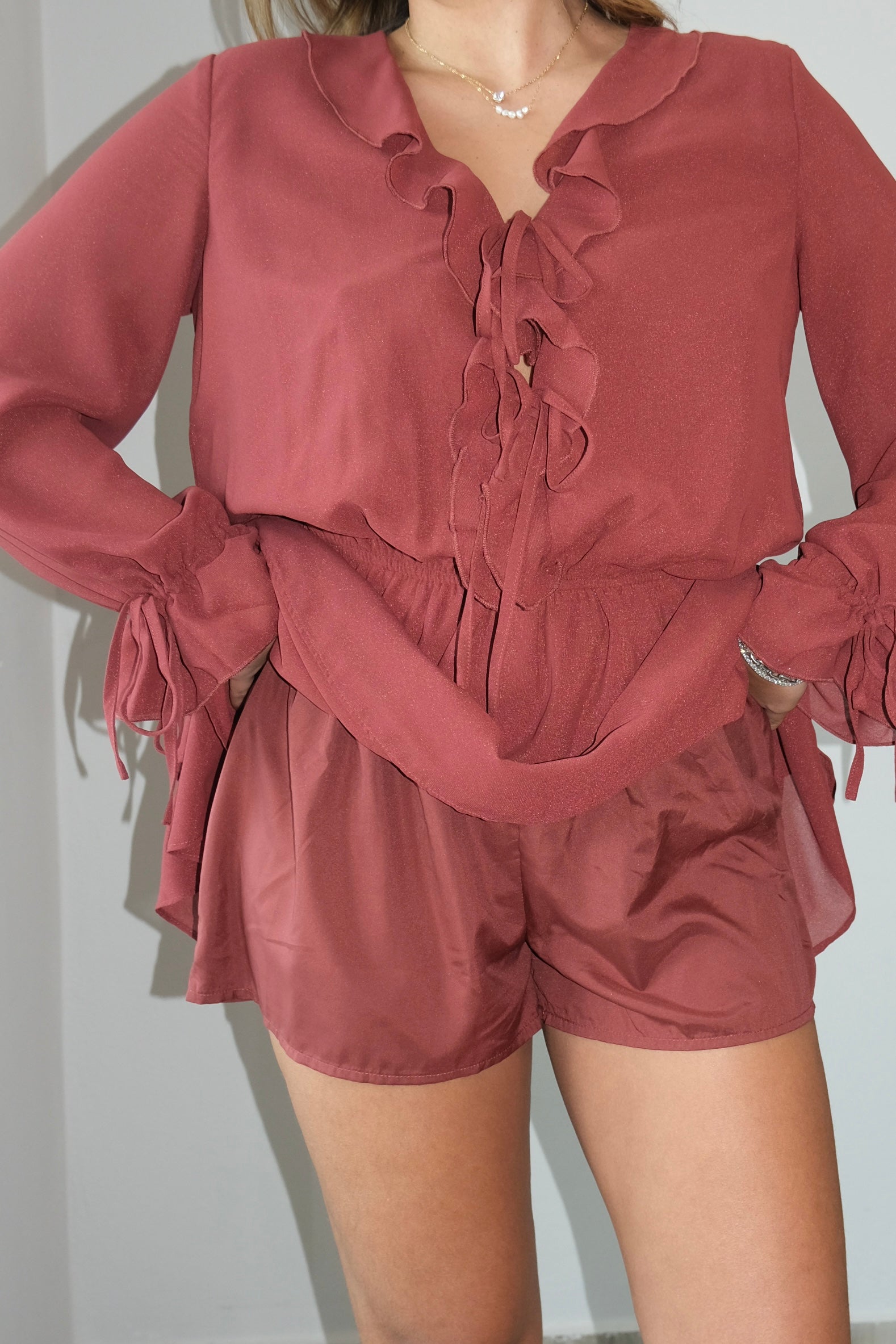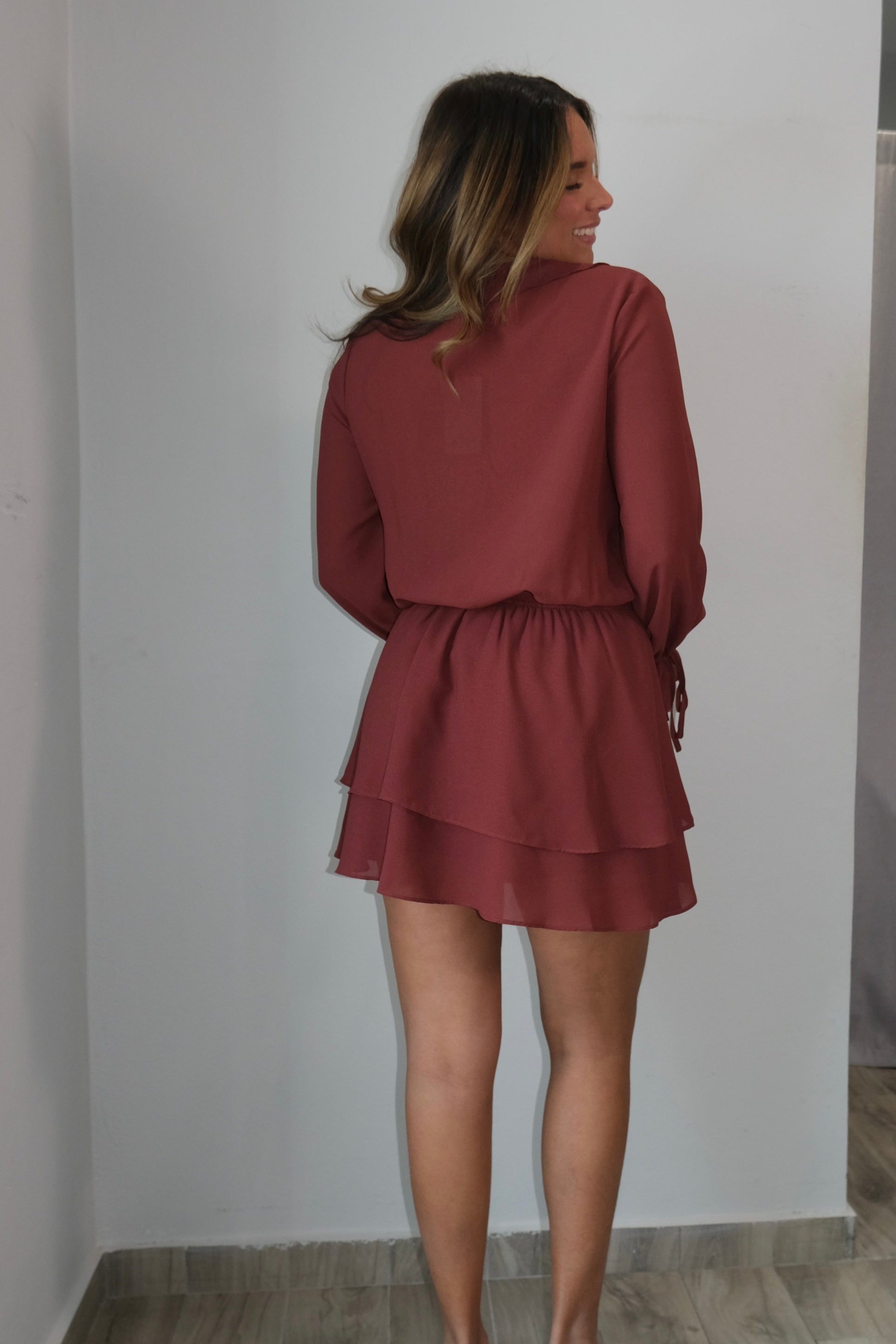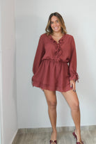 Laine Frilled Long Sleeve Romper This charming dress features delicate frills along the long sleeves and a flattering silhouette perfect for any occasion. The model is wearing a size small. Please note this dress runs large, so you may want to size down for the best fit. Soft and elegant, it's an easy go-to piece for your wardrobe.