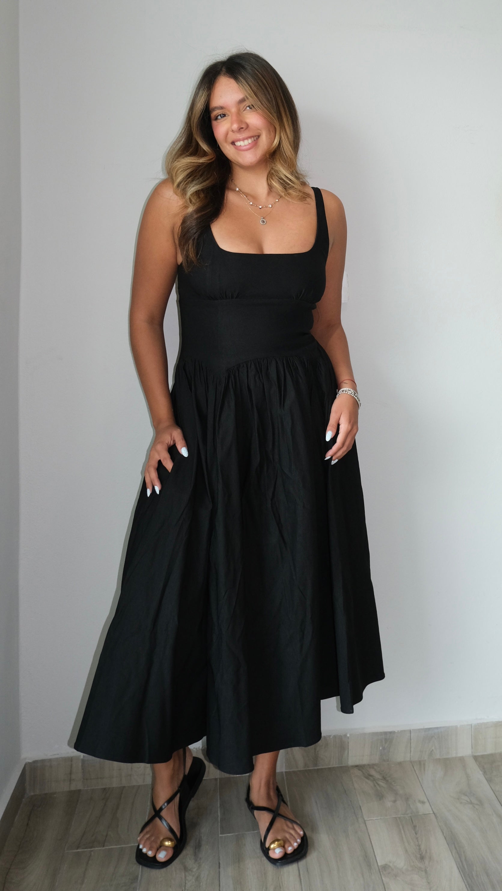 Adeline Back Tie A Line Dress features a flattering silhouette crafted from a breathable rayon and nylon blend with 5% spandex for gentle stretch and comfort. The signature back tie detail adds a fashion-forward touch perfect for elevated everyday wear or special occasions. Runs true to size—our model wears a small. The fabric drapes beautifully while the spandex ensures ease of movement throughout your day.