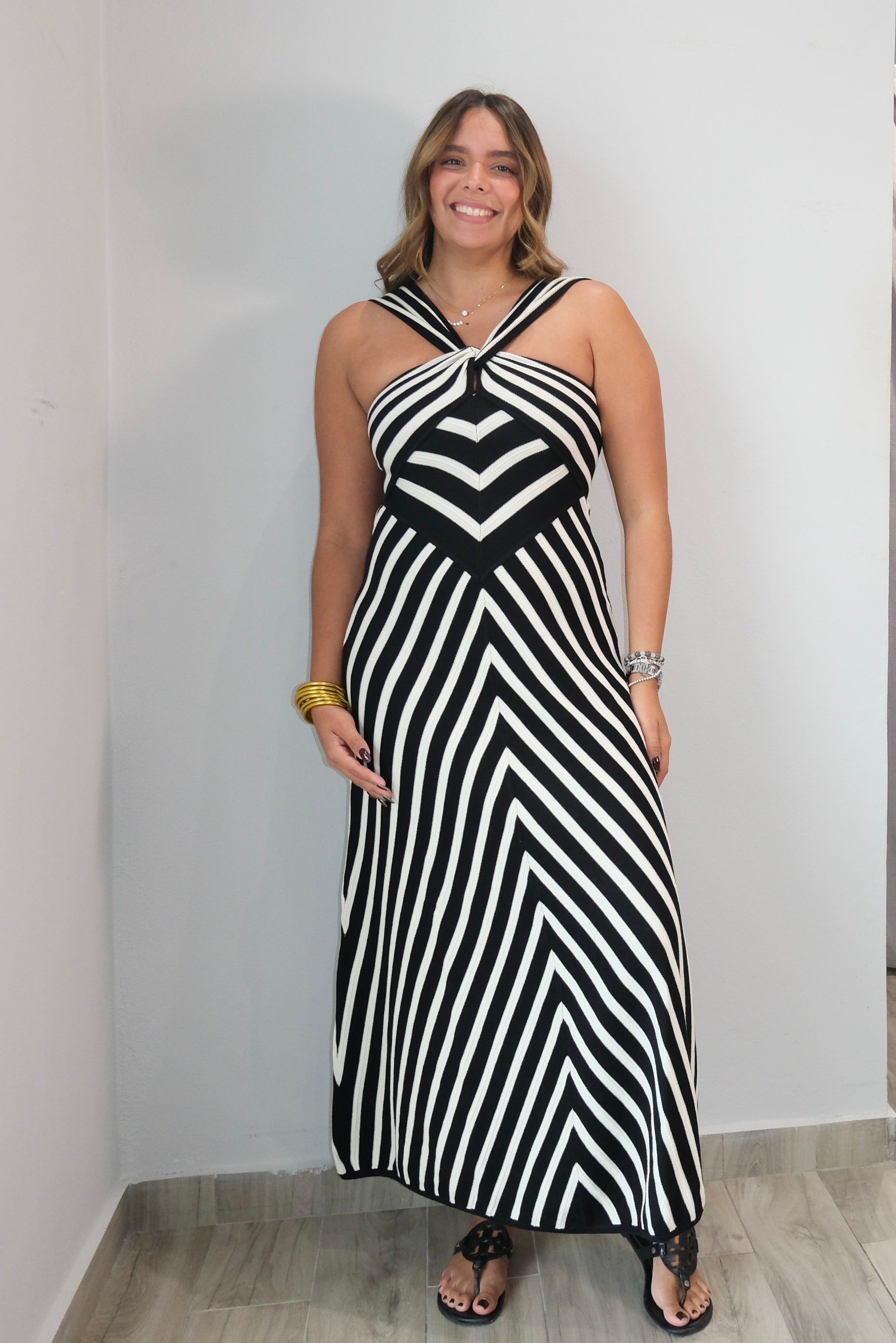 The Andrea Striped Knit Dress is perfect for any occasion. Made with a 70% rayon and 30% nylon blend, it offers a very stretchy fabric that is comfortable and flattering. Crafted to run true to size, this dress is guaranteed to fit you perfectly. Model is wearing a size small