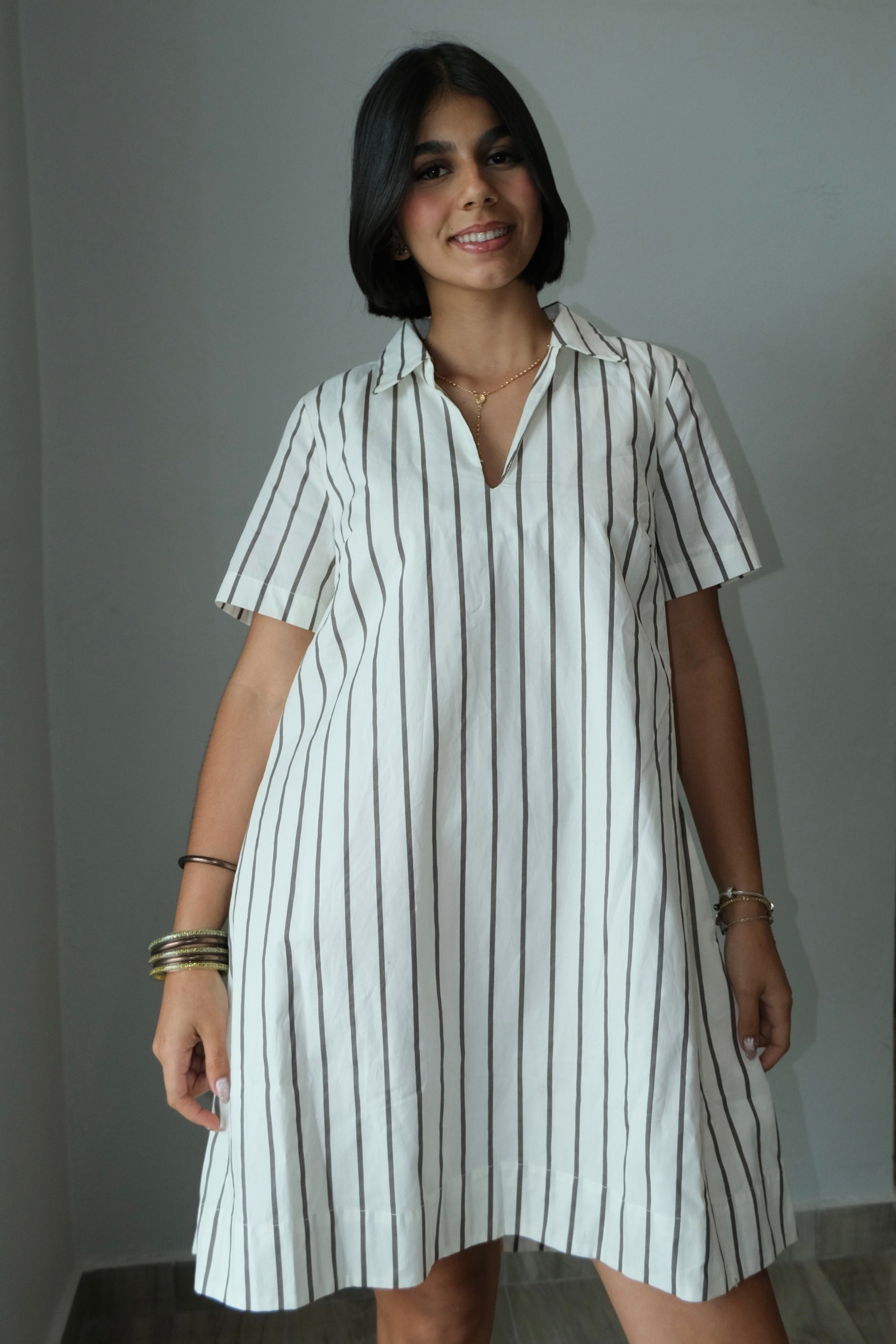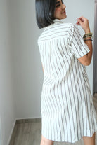 Angelica Stripped Down Collared Dress runs generously oversized for a relaxed, effortless fit. Model pictured wears size XSmall. Crafted from 100% cotton, this piece offers breathable comfort and natural drape perfect for layering or wearing solo.