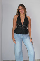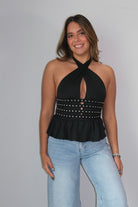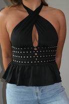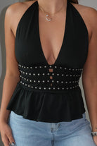 The Audrey Halter Stud Detailed Top offers a flattering fit that runs true to size for effortless styling. Designed with intricate stud detailing, this top elevates your look while maintaining comfort. Our model wears a size small, providing a clear guide for selecting your perfect fit. Ideal for both casual and dressy occasions, it effortlessly combines edgy design with wearable versatility.