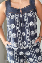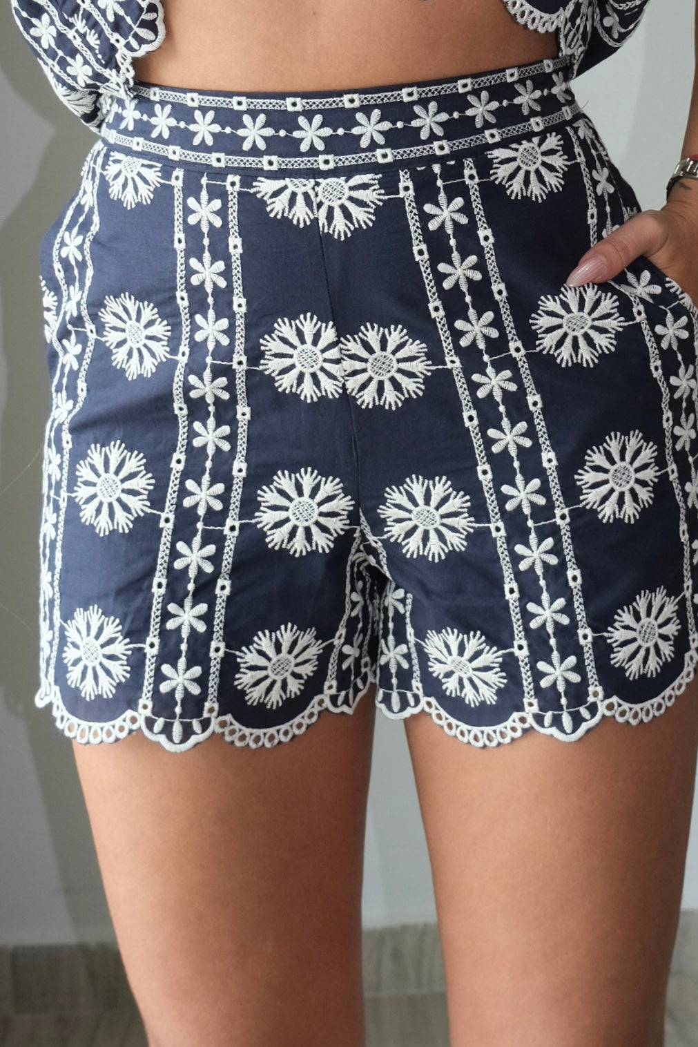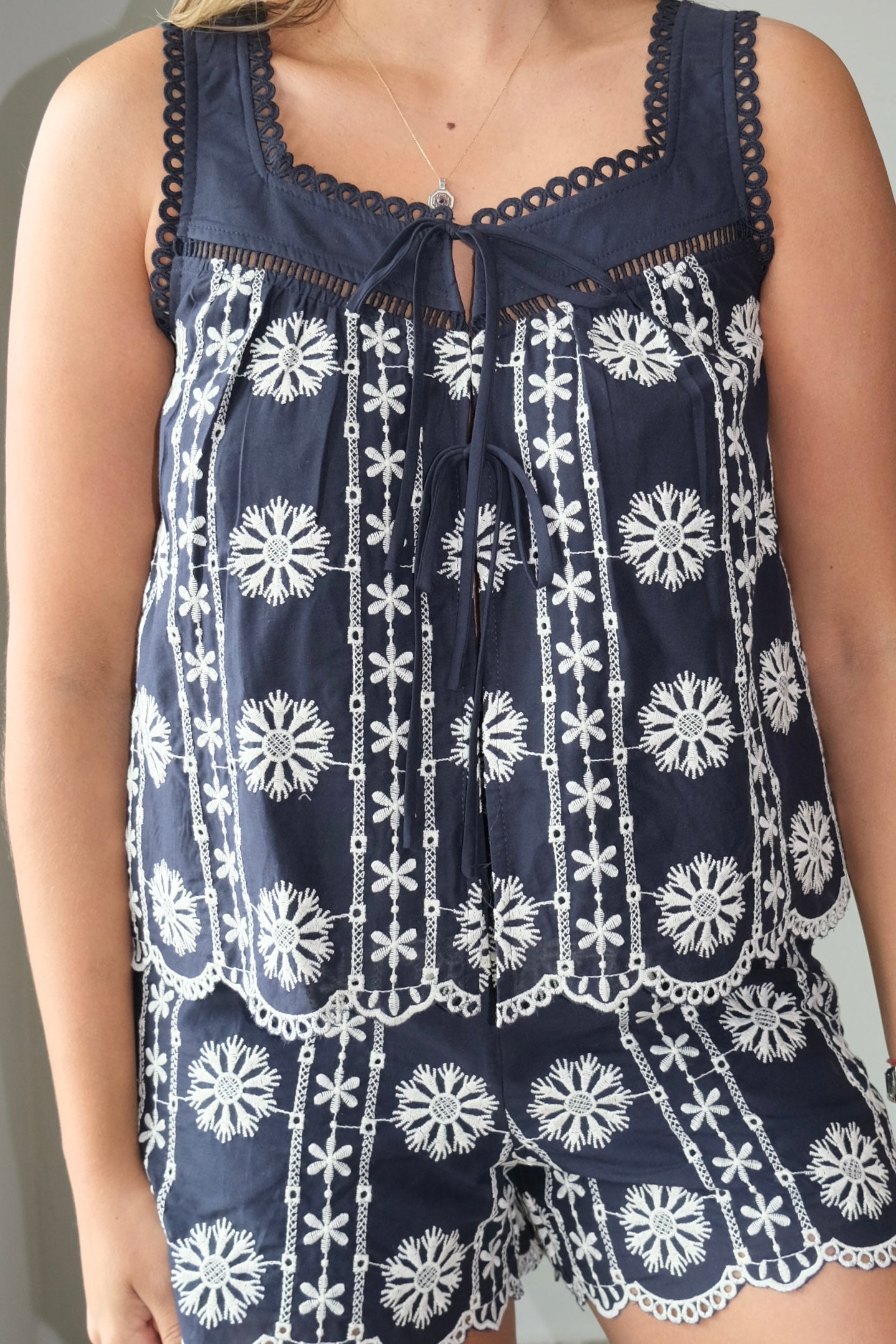 Ava Embroidered Tie Top & Shorts Set features a stylish tie top paired with comfortable shorts. The shorts include an elastic band at the back for a secure fit and an invisible zipper for a sleek look. This set runs true to size. The model is wearing a size small. Perfect for casual outings or relaxed days at home.