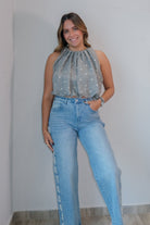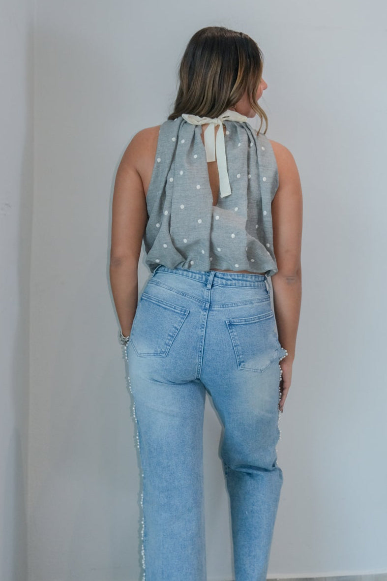 The Ayla Polka Dot Halter Top offers a comfortable fit with its true-to-size design and elastic waistband, enhancing flexibility around the waist. Crafted from 100% polyester, this top provides durability and easy care while maintaining a lightweight feel. Ideal for effortless styling, it pairs well with casual or dressier looks. The model is shown wearing a size small for reference.