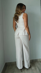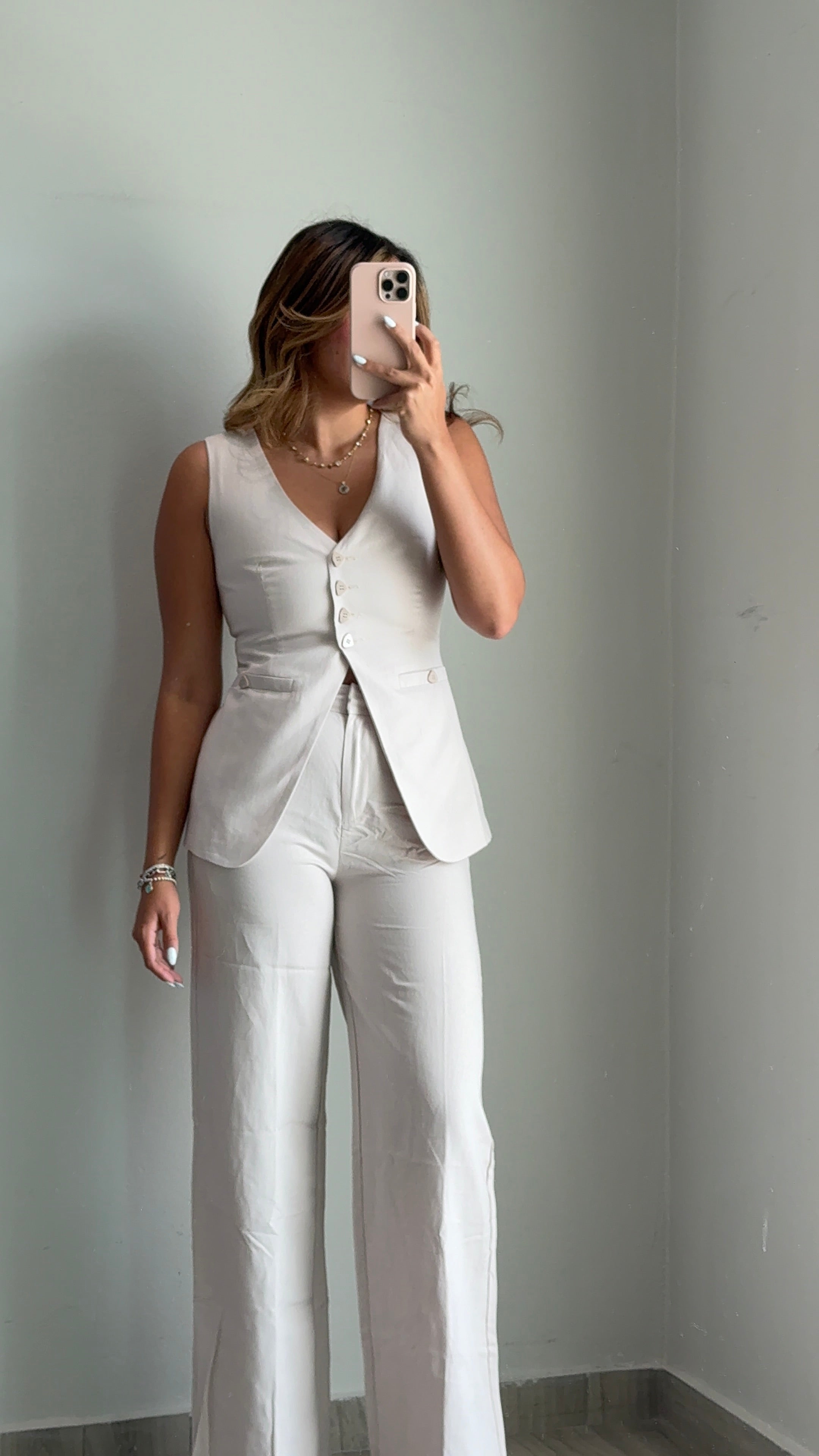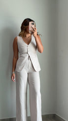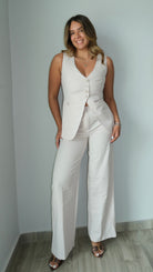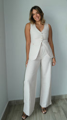 Effortless elegance meets comfort in this two-piece set. The button-down vest top features a relaxed silhouette perfect for layering, while the coordinating pants offer a polished finish. Crafted from a breathable blend of rayon, linen, and cotton, this set moves with you throughout the day. Runs true to size. Model wears size small; if between sizes, we recommend sizing up for optimal comfort and fit. Fabric: 50% Rayon, 30% Linen, 20% Cotton