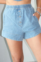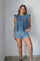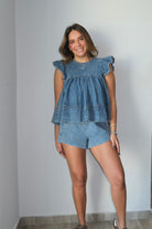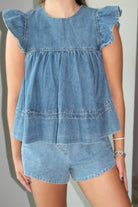 Callie Flutter Sleeve & Boxer Shorts Denim Set This charming two-piece denim set features flutter sleeves and coordinating boxer shorts for a playful, put-together look. The soft cotton-blend fabric with a touch of spandex offers comfort and flexibility throughout your day. Runs true to size—our model wears a small. Perfect for casual outings or relaxed weekend vibes.