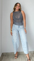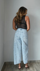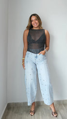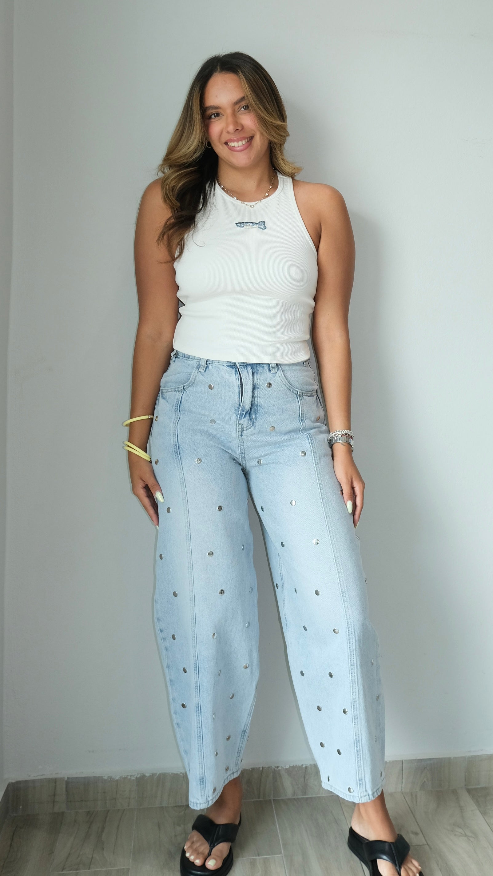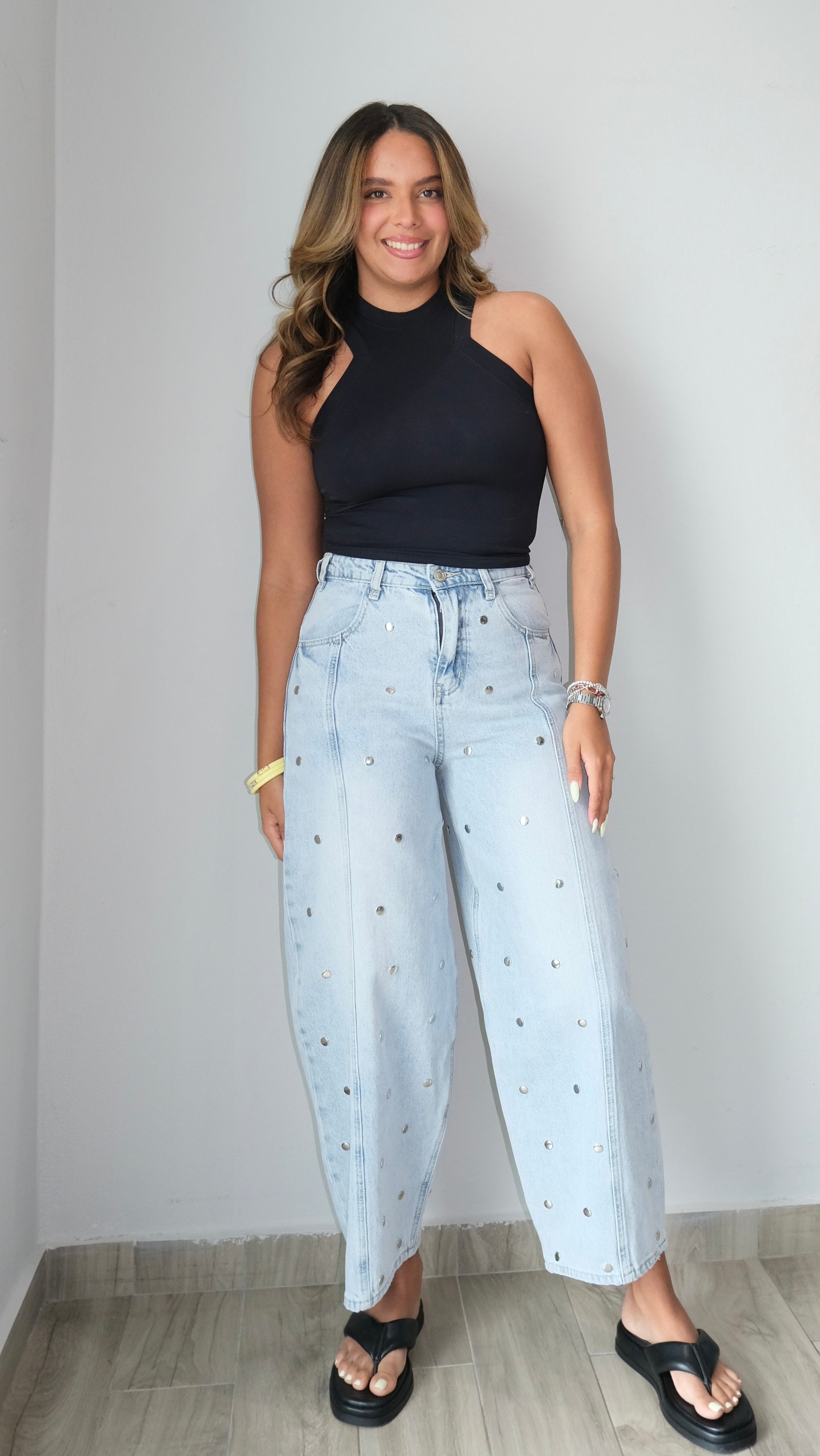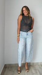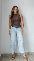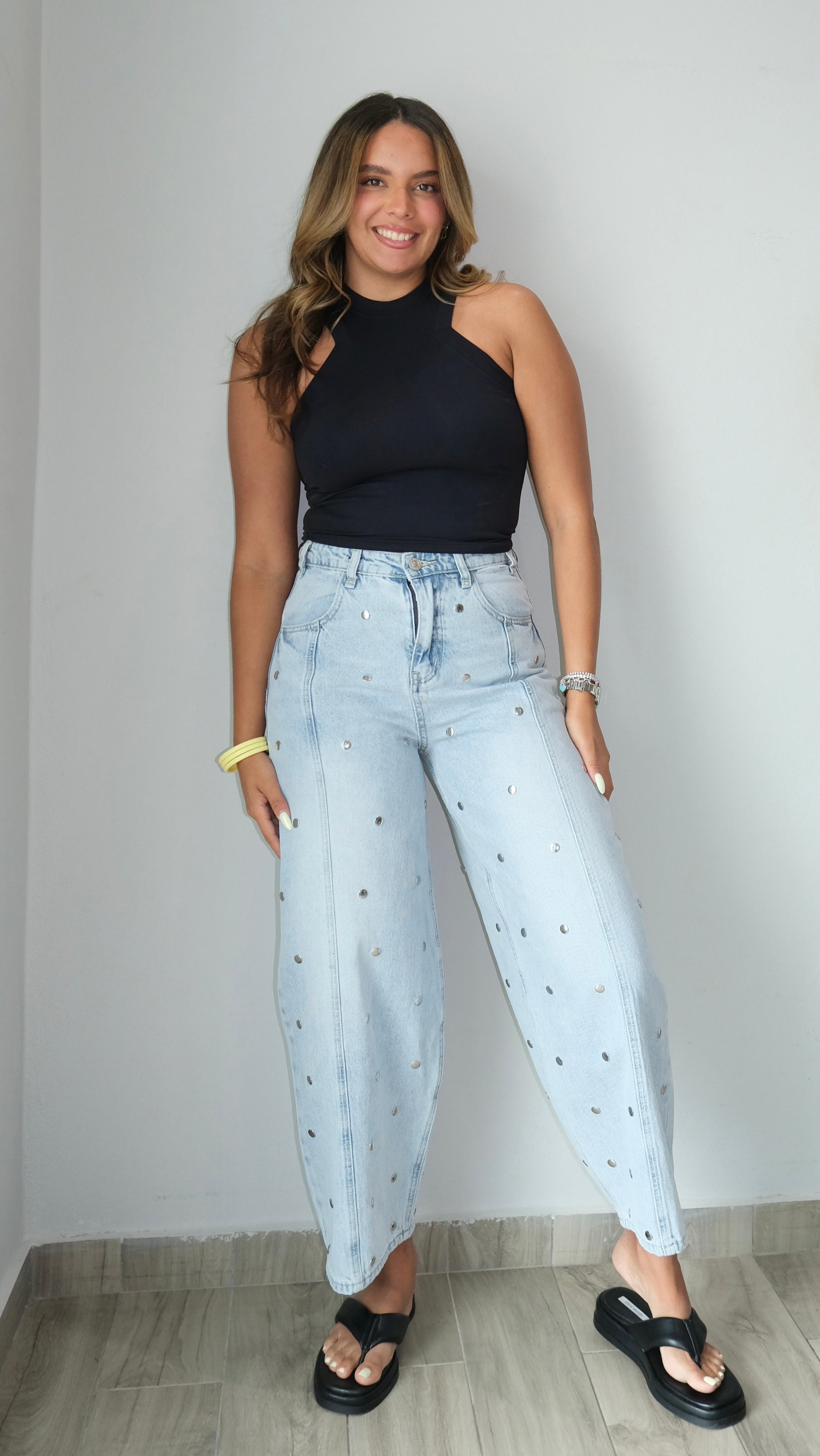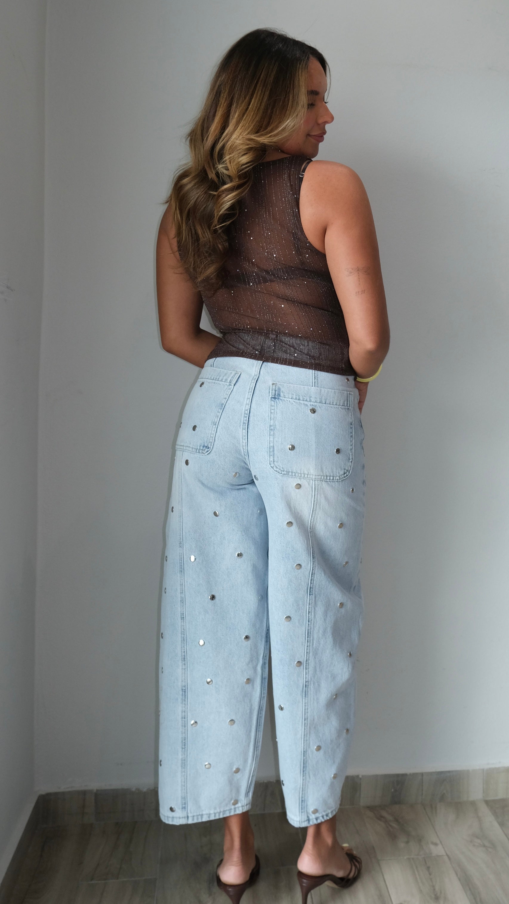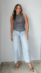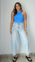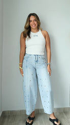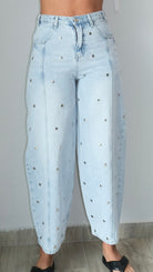 Cecilia Studded Barrel Jeans run true to size. Model is wearing a small. Crafted from 100% cotton with no spandex for a structured, authentic denim feel. We recommend sizing up for a relaxed, comfortable fit.