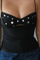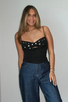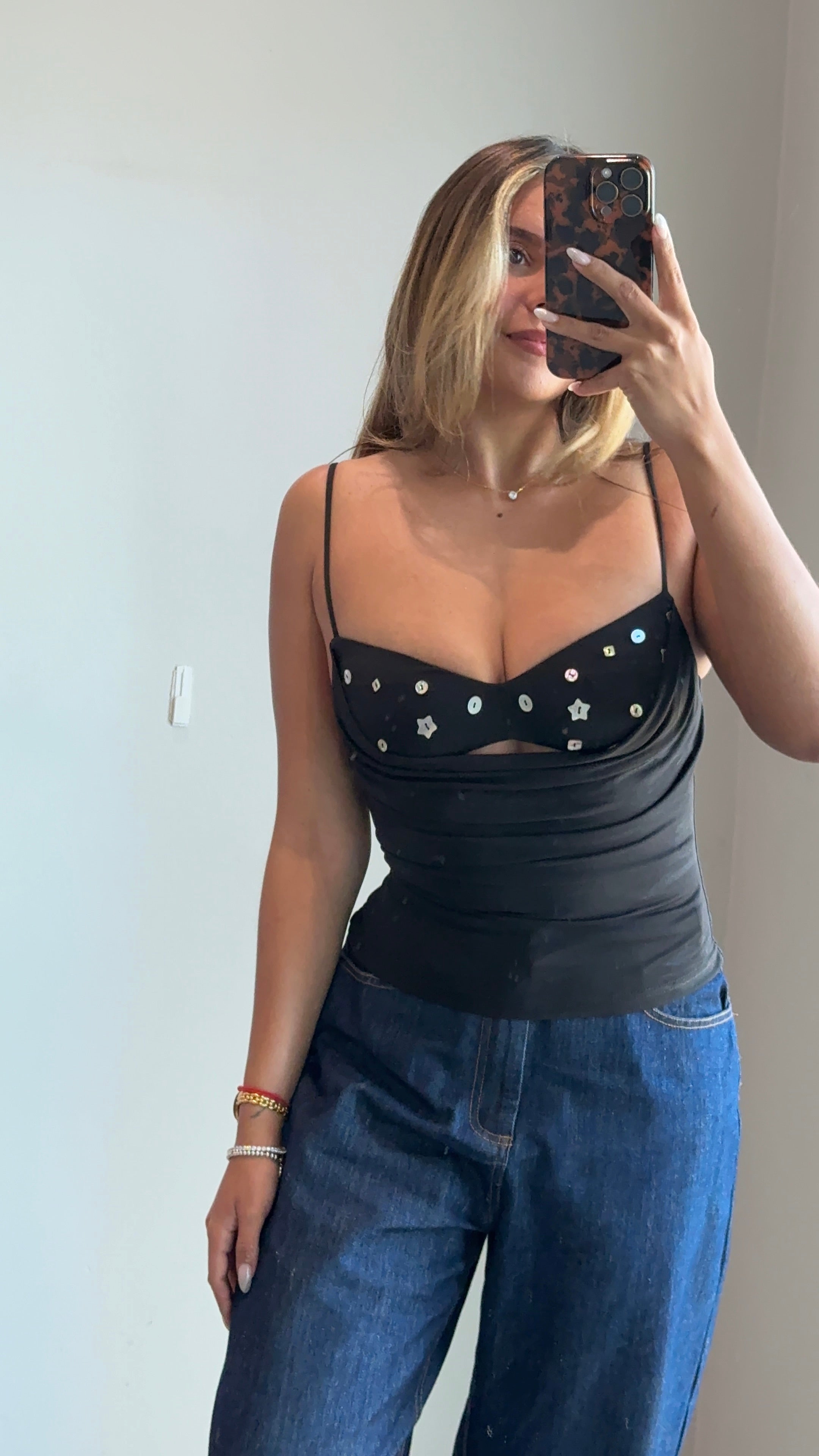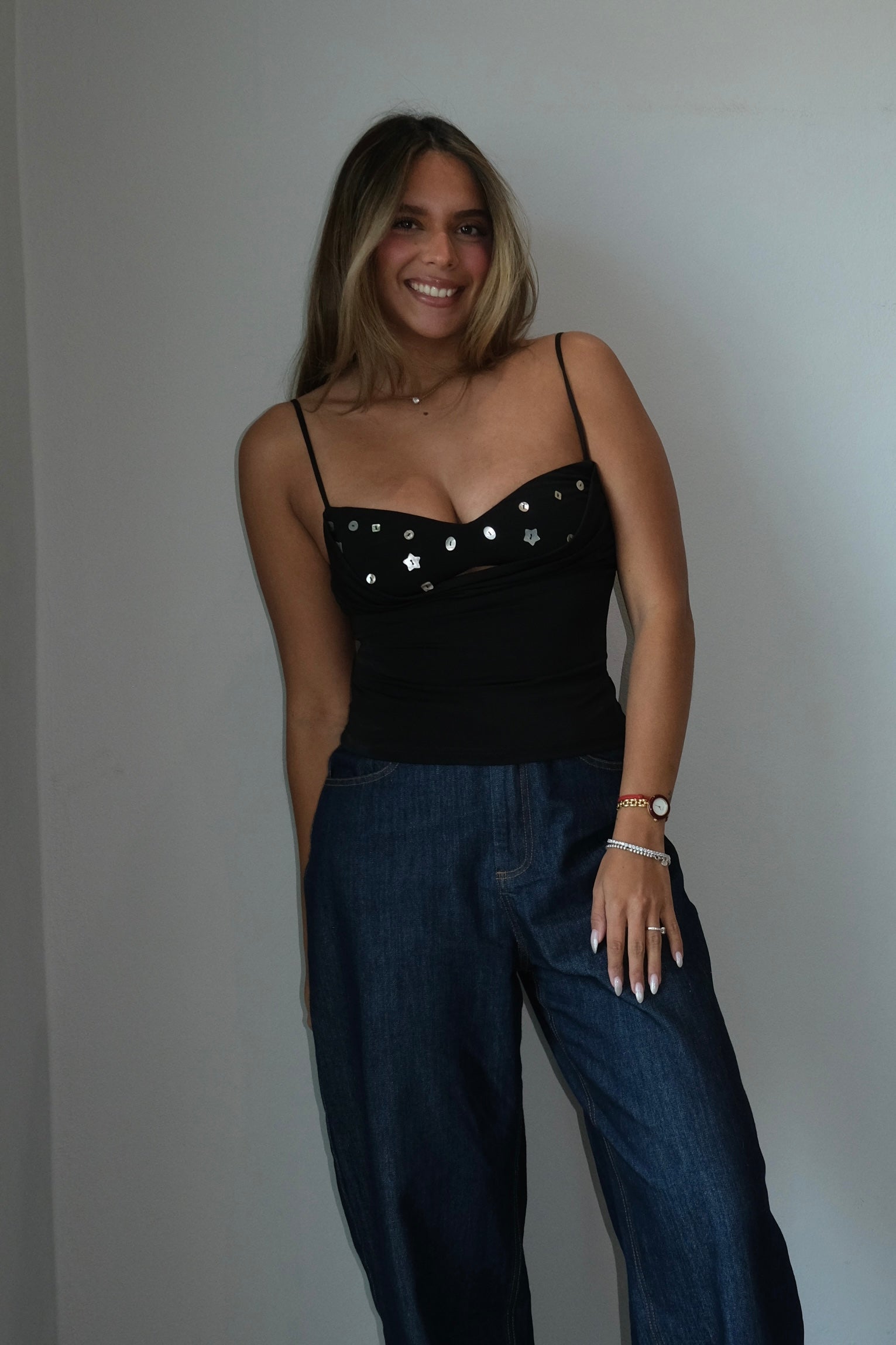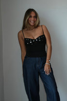 Celeste Mother Pearl Beaded Cami Top features a beautiful shell made from 95% polyester and 5% spandex blend. The beaded design adds elegant detail to this versatile piece. This top runs true to size. The model is wearing a size small. Perfect for layering or wearing on its own, this cami top offers comfort and style for any occasion. IF IN BETWEEN SIZE GO A SIZE UP