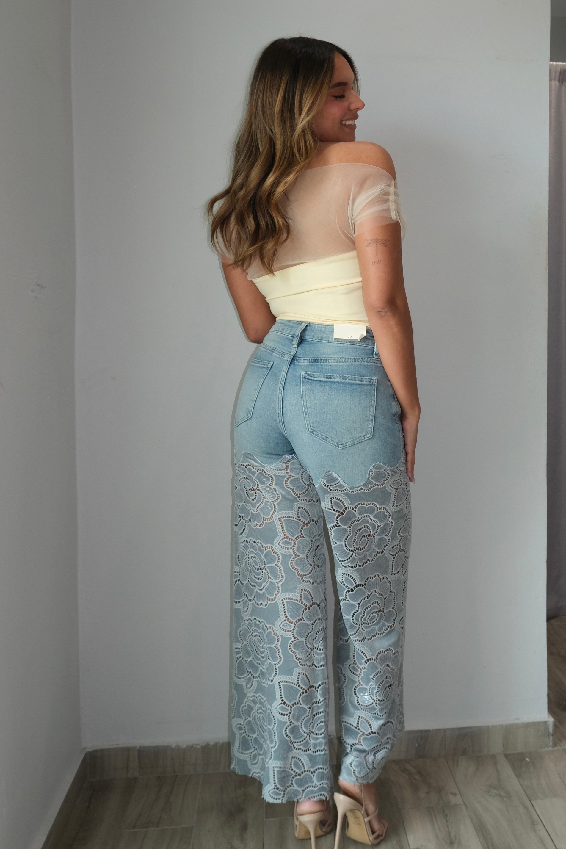 These Florence Stud Lace Super Highrise Jeans feature power stretch and a super high rise for a flattering fit. Made of 92% cotton, 5% polyester, and 3% spandex, these jeans run true to size and provide comfortable wear. The model is wearing a size 3.