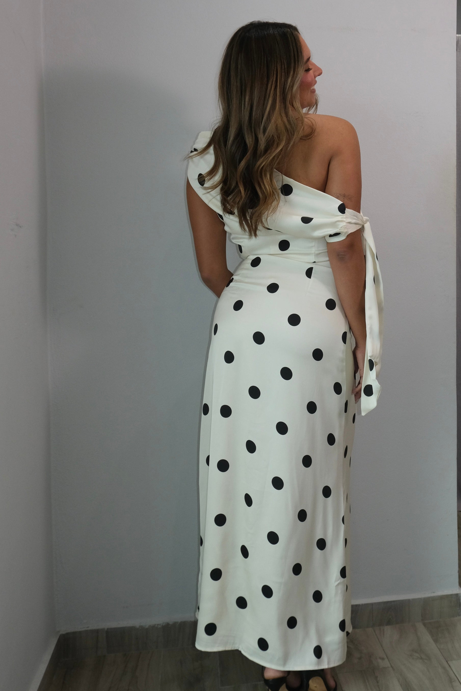 The Chloe Polka Asymmetrical Dress features a sleek satin fabric with a flattering asymmetrical cut. An invisible side zipper provides a seamless, polished look. This dress runs true to size, so choose your regular size for the perfect fit. Our model wears a small. Effortless elegance for any occasion.