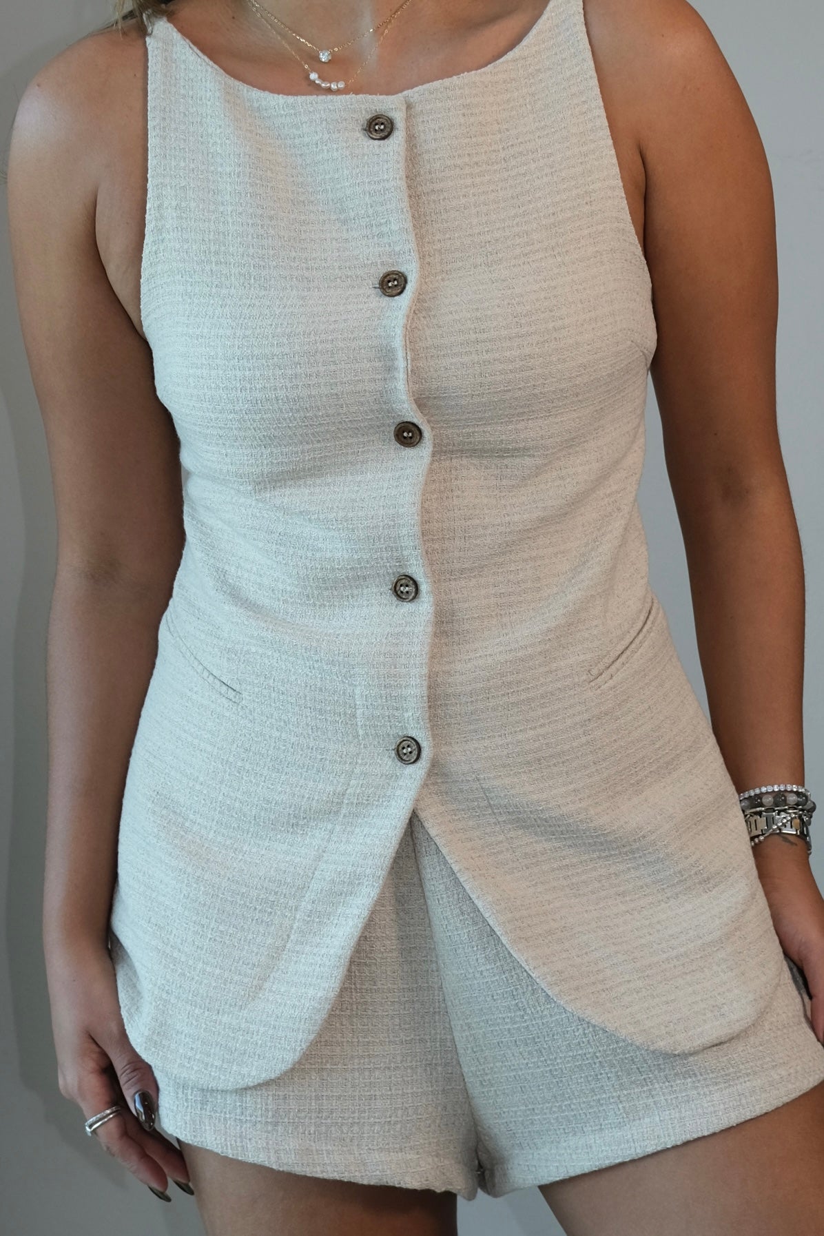 This Chloe Twill Button Down Vest Top & Short Set offers a tailored fit that runs true to size, ensuring a flattering silhouette. The model is shown wearing size small. For those between sizes, it is recommended to size up for optimal comfort. Please note, the fabric does not stretch, so choosing the correct size is essential. This set combines a structured look with comfortable wear, perfect for polished casual occasions.