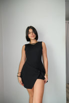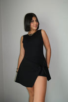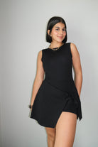 Faye Sleeveless Wrap Tie Front Romper This sleeveless romper features a wrap design with a tie front detail for an adjustable, flattering fit. Made from a blend of 82% polyester and 18% spandex, the fabric offers stretch and comfort for all-day wear. The romper runs true to size. Model pictured is wearing a small.