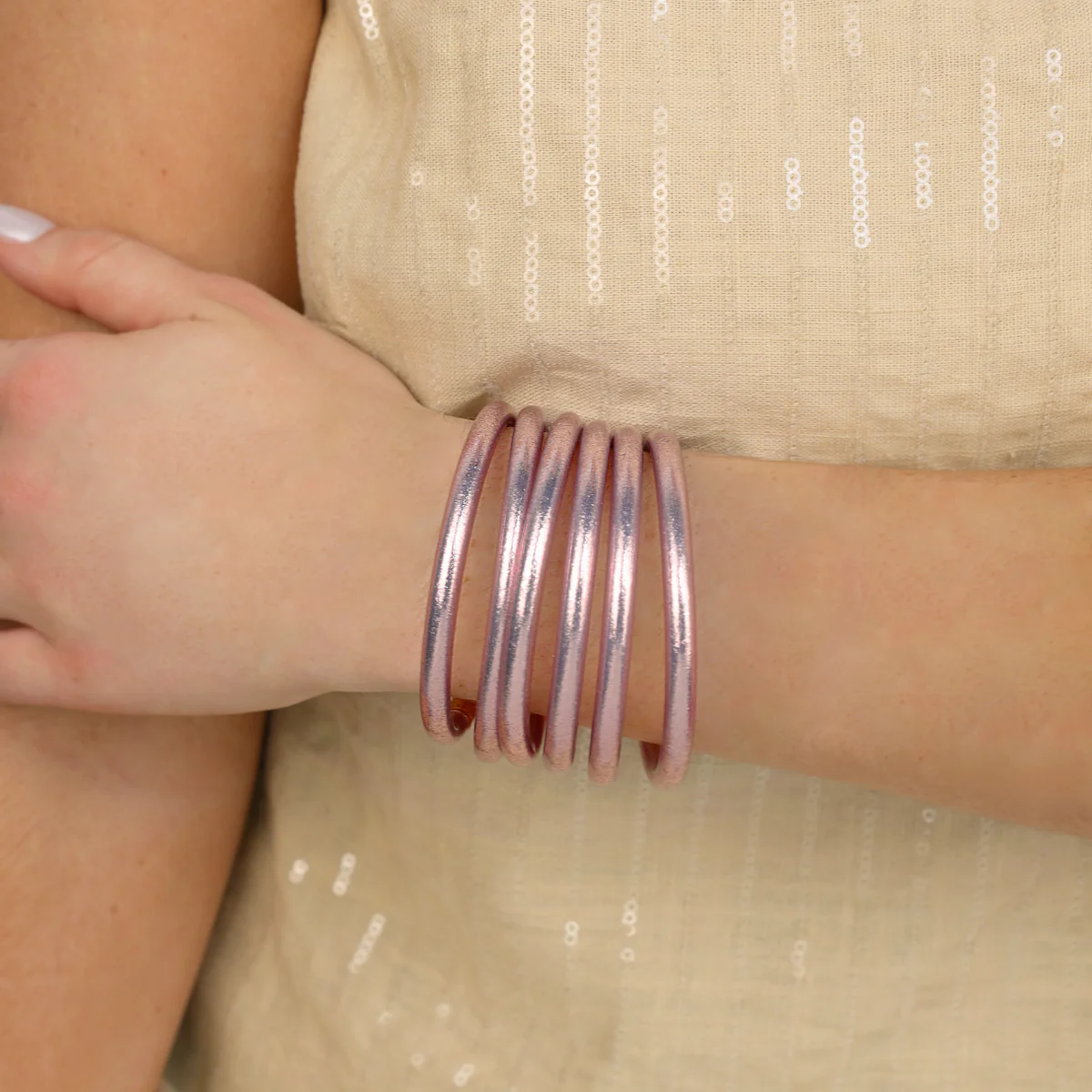 BuDhaGirl introduces Ice Rose to our All-Weather Bangle® collection: a cool pink that blends the crispness of ice with the beauty of rose. Ice Rose is delicate, luminous, and quietly transformative—the hue of morning light dancing on sea glass kissed by soft waves. Ice Rose is not merely a color; it is an invitation to see beauty in the gentlest of moments.