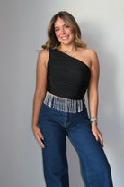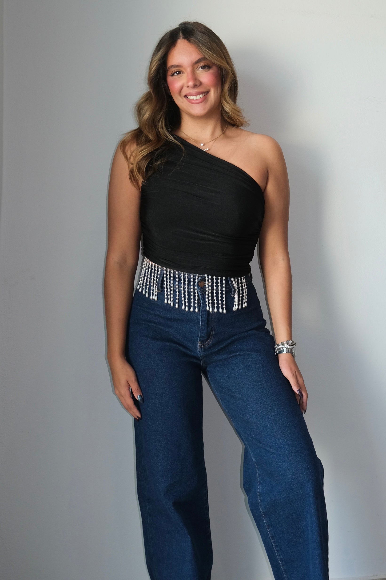This Julieta One Shoulder Pearl Fringe Top is a stunning addition to any wardrobe. The one-shoulder design and ruched top add a touch of elegance, while the pearl fringe hem adds a unique and eye-catching detail. Made with lightweight and non-sheer fabric, this top runs true to size for a comfortable and flattering fit, as shown in our model wearing a size small. Expertly crafted from 95% polyester and 5% spandex for a high-quality and durable piece.