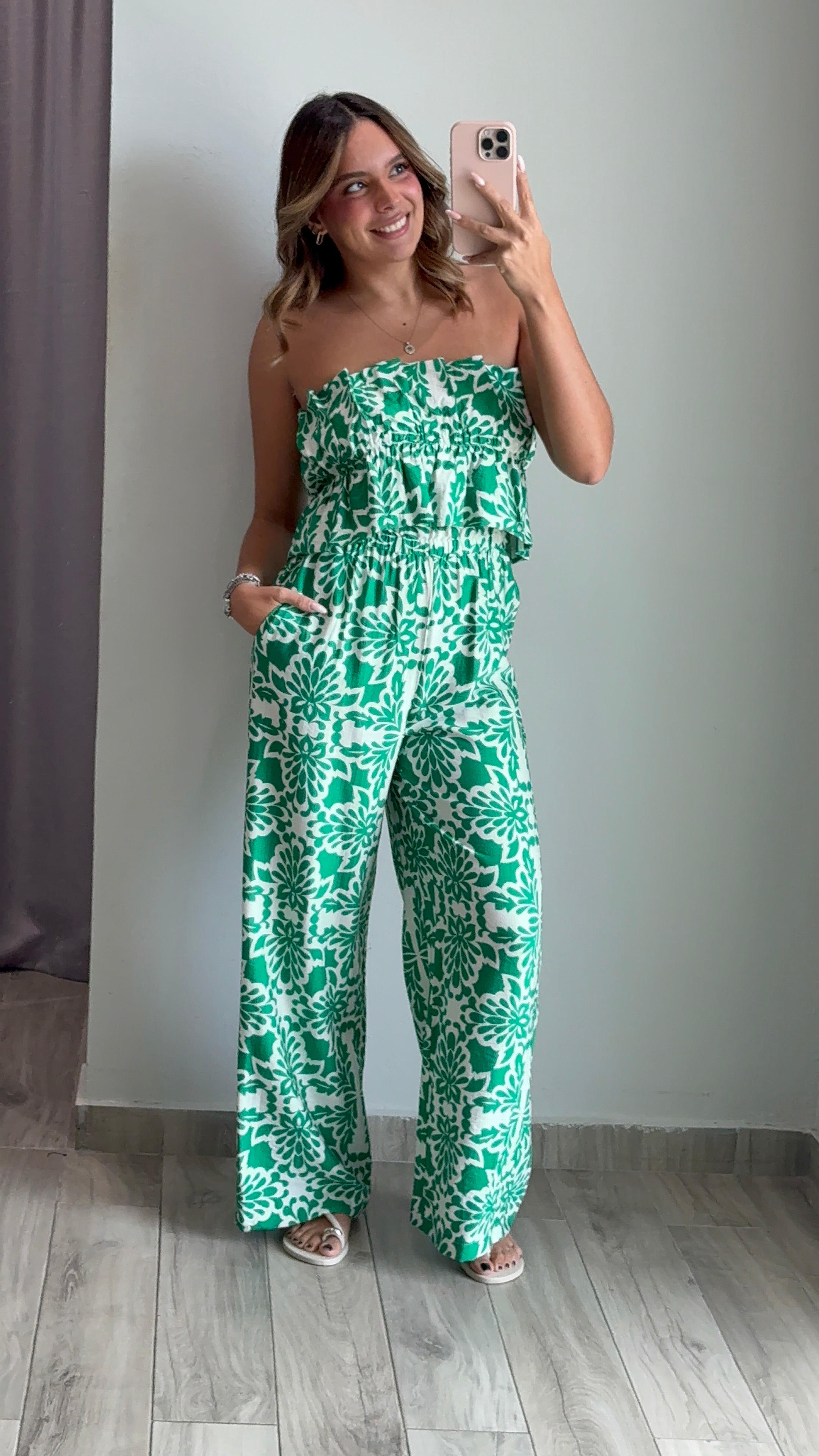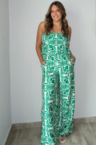 Juniper Printed Wide Leg Jumpsuit Effortless style meets comfort in this printed wide leg jumpsuit. Made from a soft viscose and nylon blend, this piece drapes beautifully while maintaining its shape. The relaxed wide leg silhouette creates a flattering, modern look perfect for any occasion. Runs true to size. Model pictured wears a small.