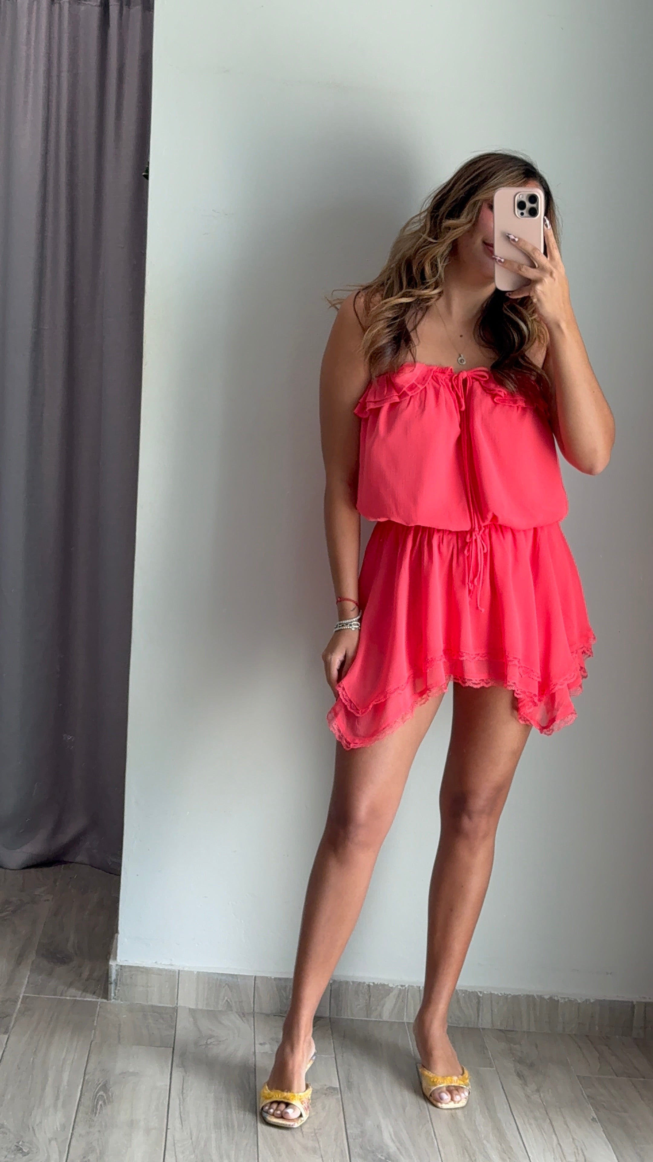 The Lacie Ruffle Lace Romper is a playful one-piece designed to fit true to size. Made from 100% polyester, this romper features delicate lace detailing and charming ruffles throughout. The model pictured is wearing a size small, giving you a reference for how the fit looks on frame. Perfect for a night out or special occasion, this piece combines comfort with a feminine, trendy aesthetic.