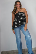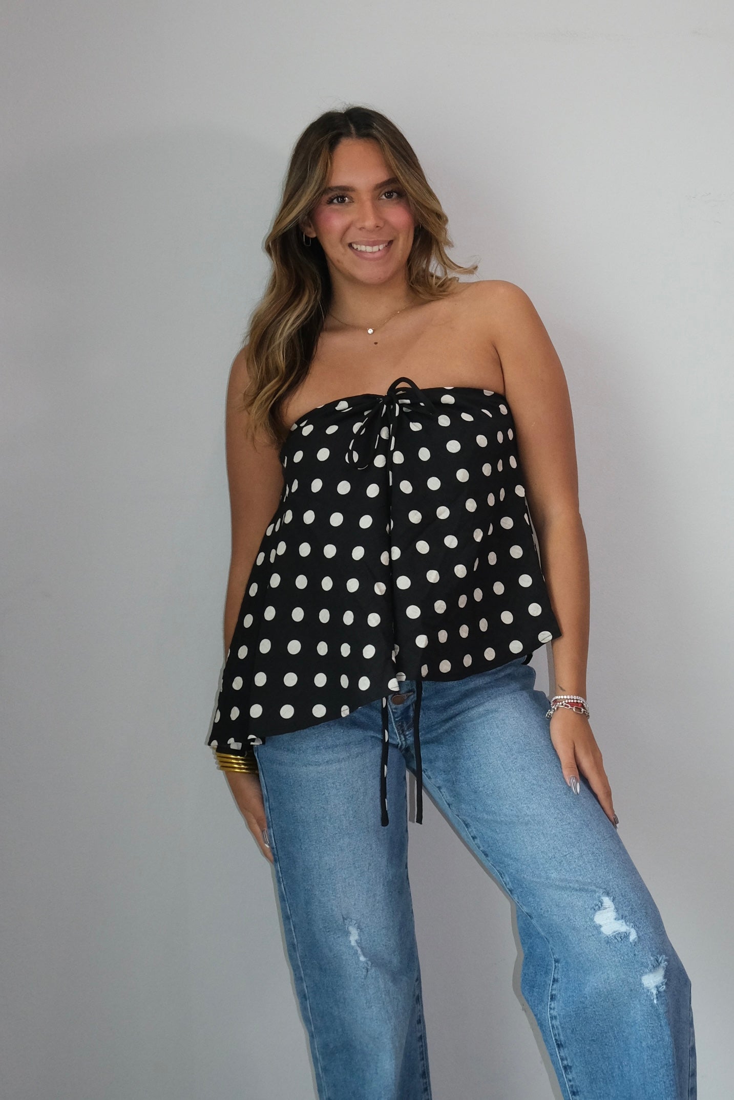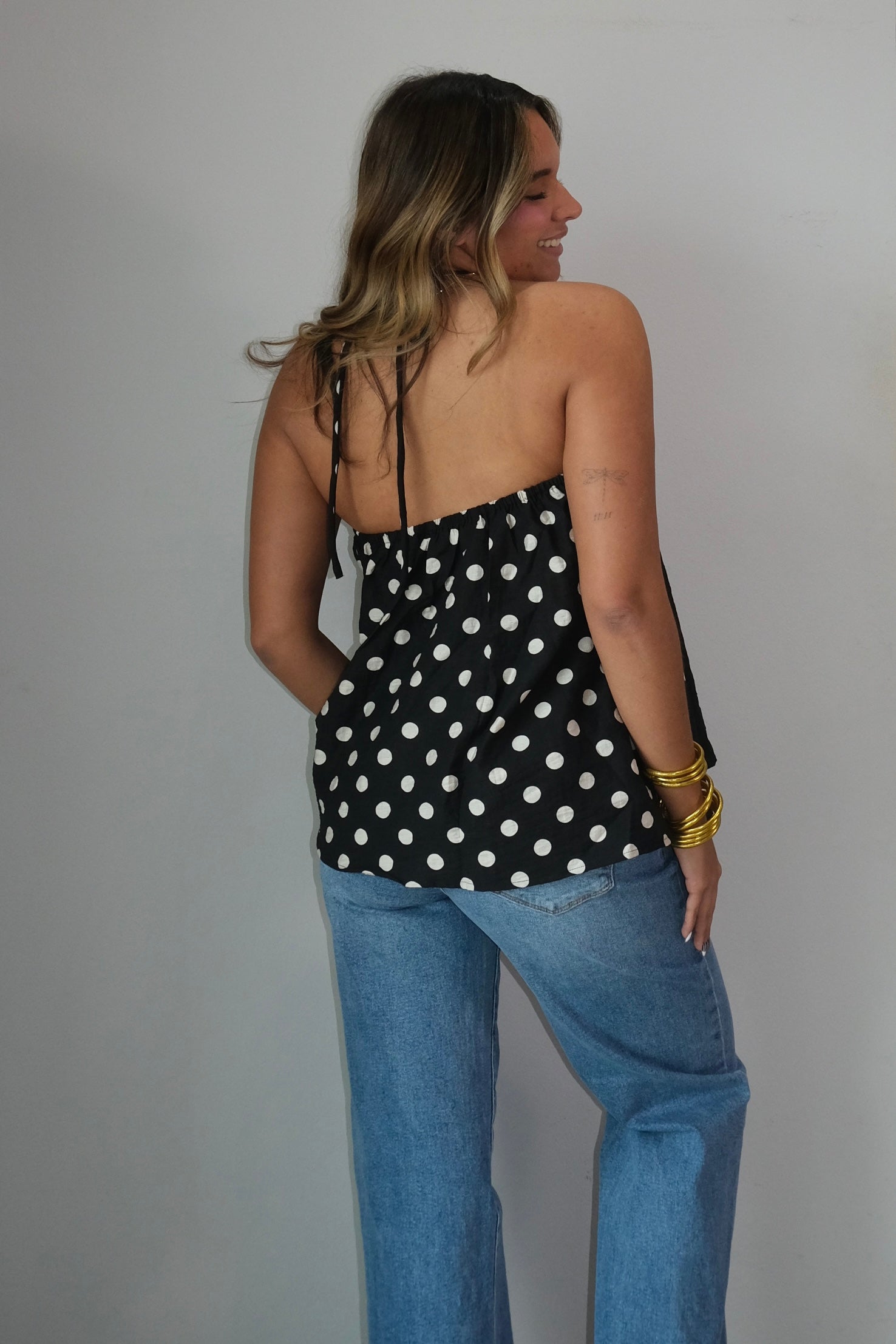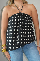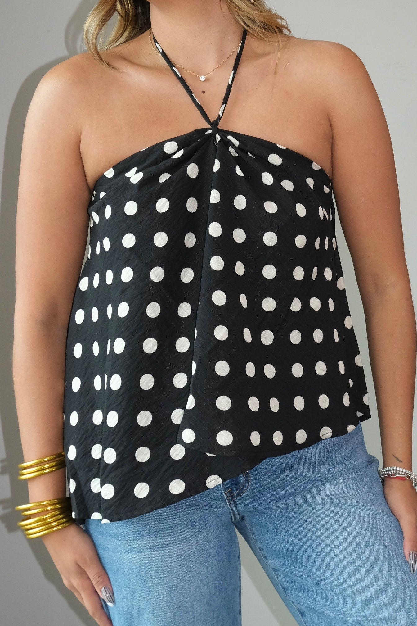 The Lana Halter Polka Dot Top runs true to size. The model is wearing a small. You can go a size down if you prefer a fitted look. The fabric blend is 62% rayon, 23% nylon, and 15% flax. The lining is 100% cotton for comfort against your skin.