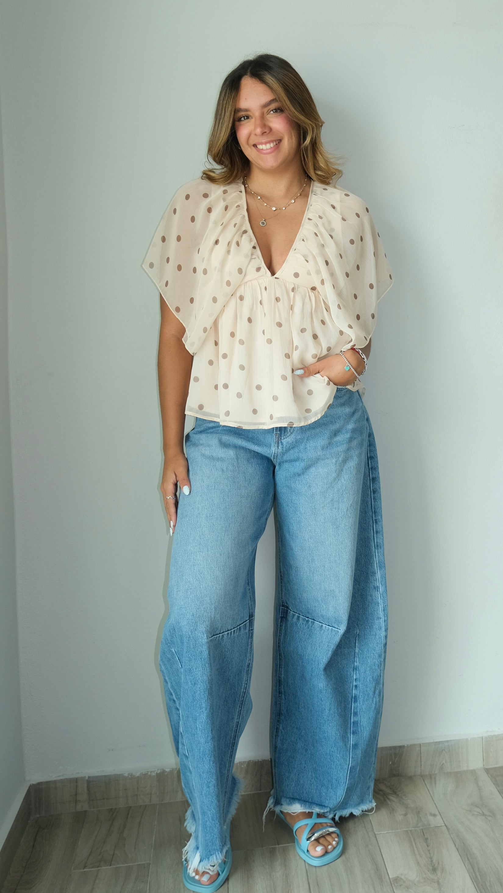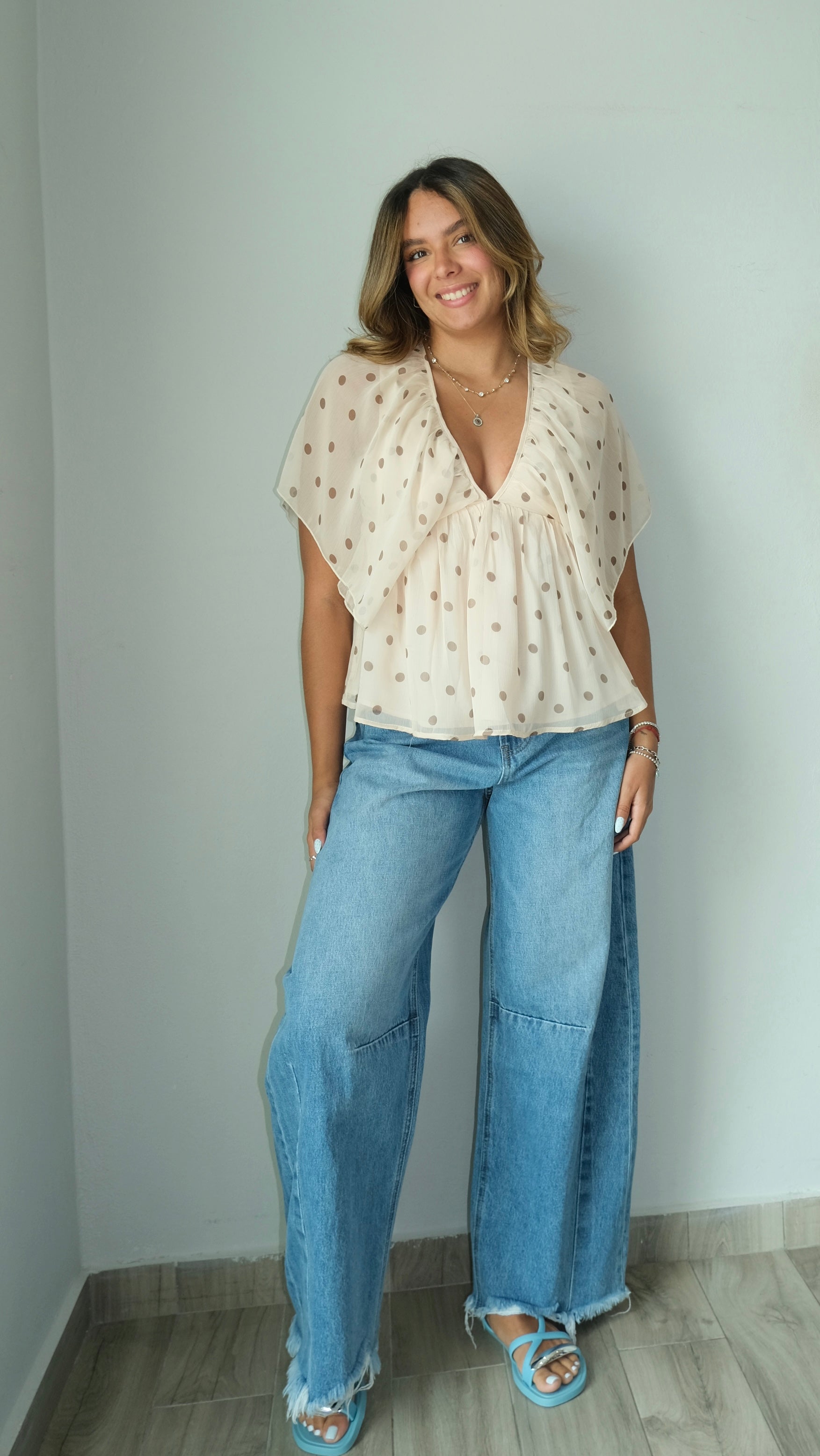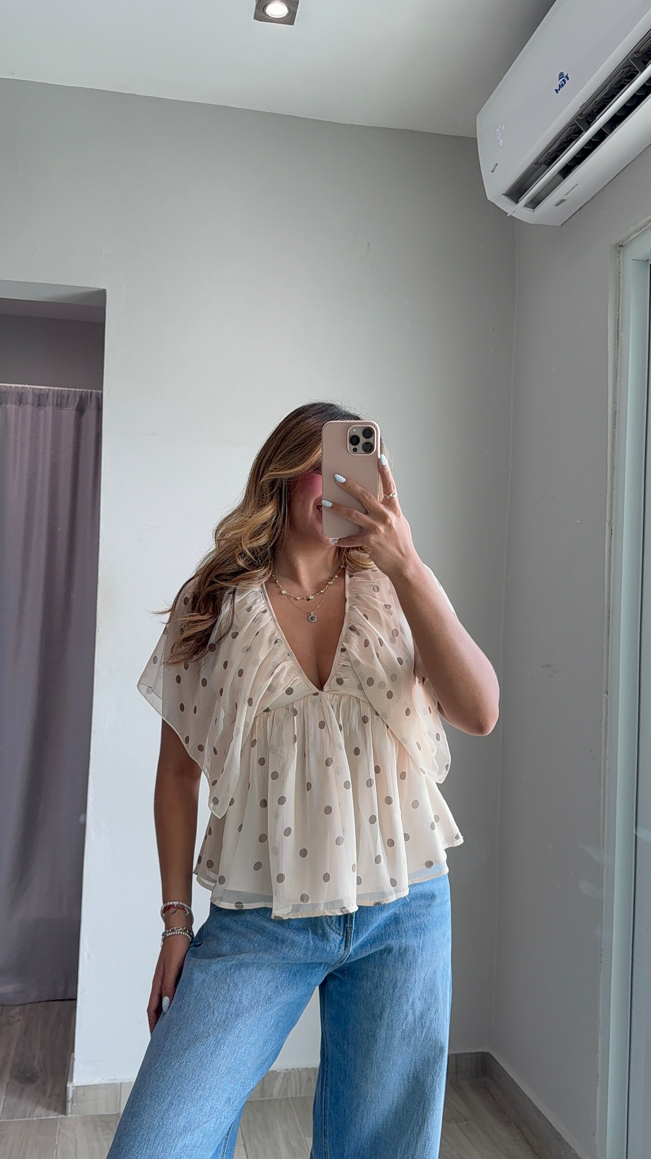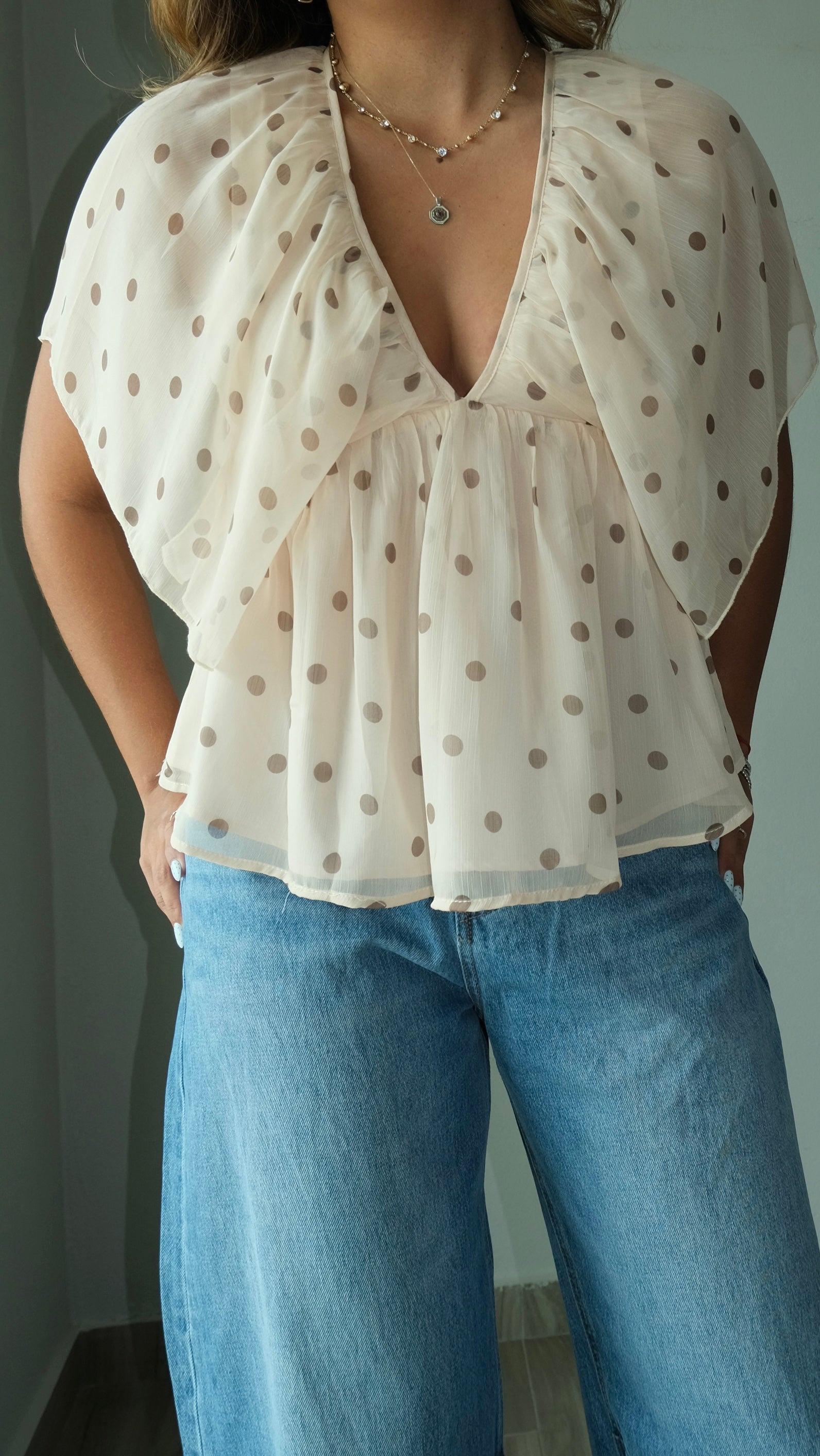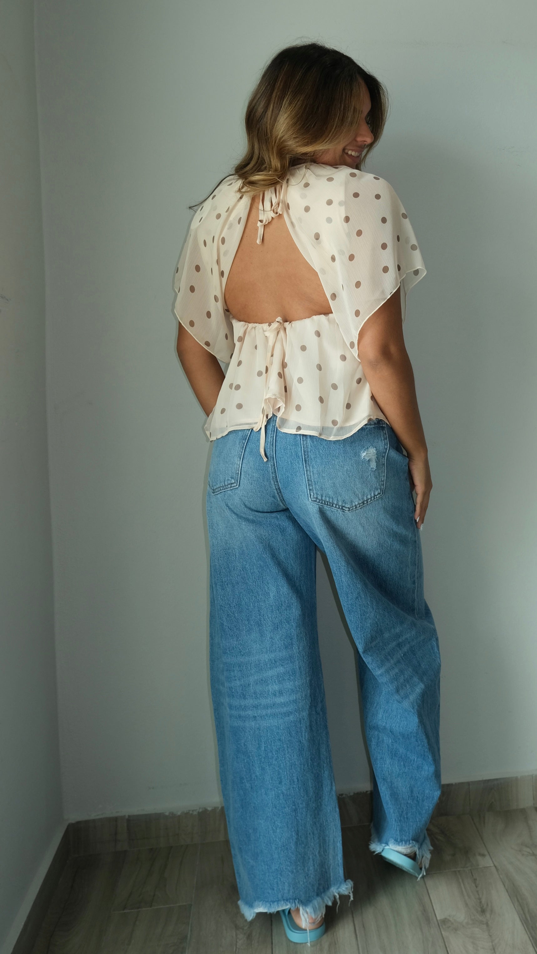 Leila Polka Dot Ruffled Open Back Top features a playful polka dot pattern with delicate ruffled detailing and a chic open back design. The asymmetrical silhouette creates movement and visual interest, perfect for layering or wearing solo. Runs true to size — our model is wearing a small. Pair with your favorite bottoms for an effortless, contemporary look.
