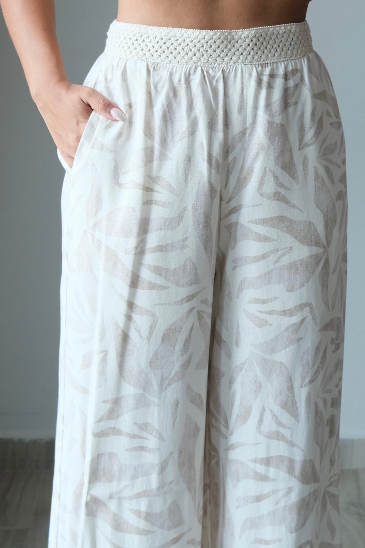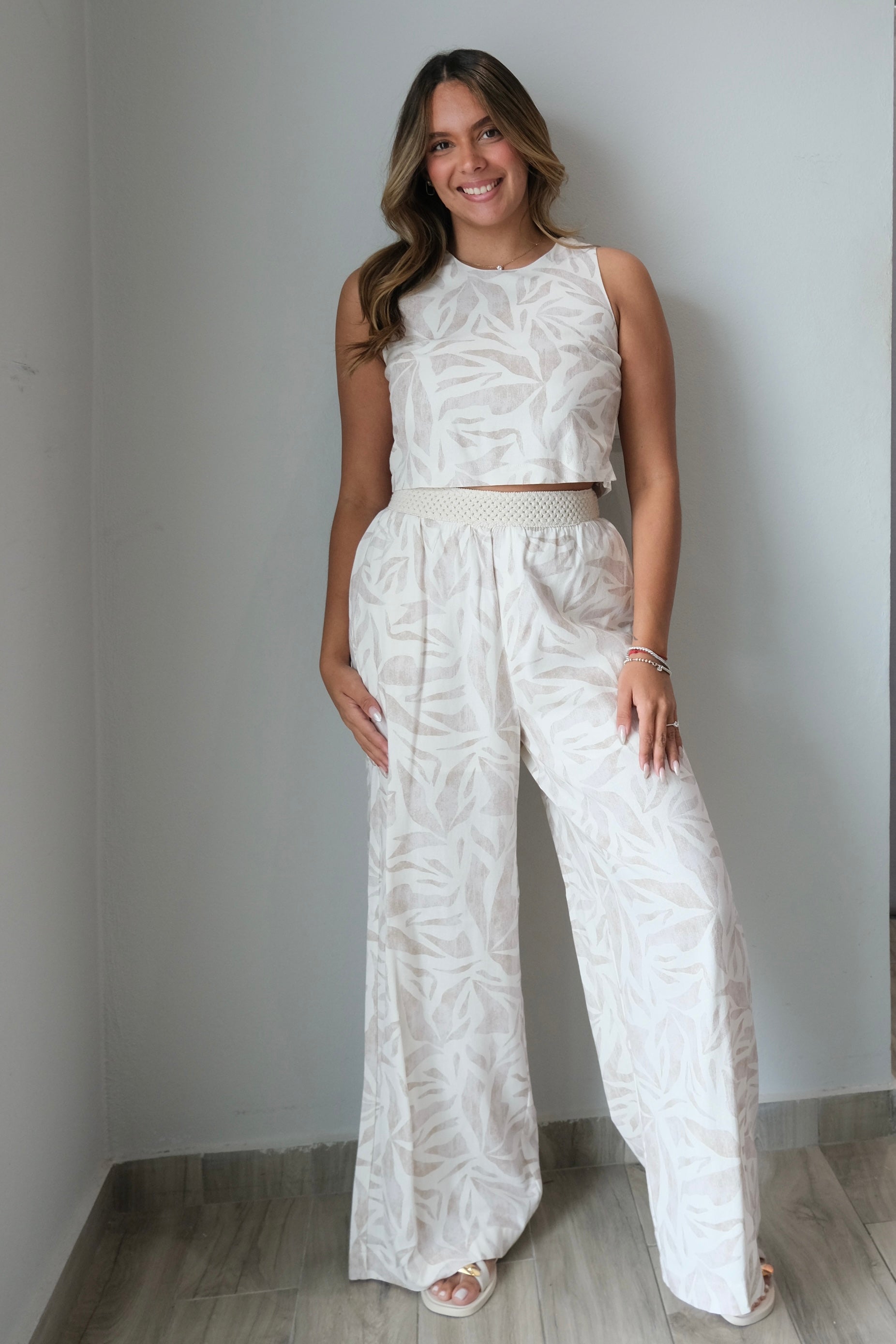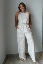 Louisa Driftwood Tie Back Top & Knit Pants offer effortless style in a breathable rayon and linen blend. The tie back top features a flattering silhouette, while the knit pants provide comfort and ease of movement. This set runs true to size—our model wears a small. Perfect for warm weather dressing, this versatile pairing works for casual outings or relaxed gatherings.