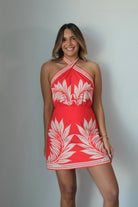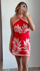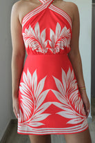 Lovely Printed Open Back Halter Dress in a flattering silhouette that runs true to size. Features an invisible side zipper for easy wear and a chic open back design. Made from 100% polyester for a smooth, comfortable fit. Model shown wearing size small. If you're between sizes, we recommend sizing up for the best fit.