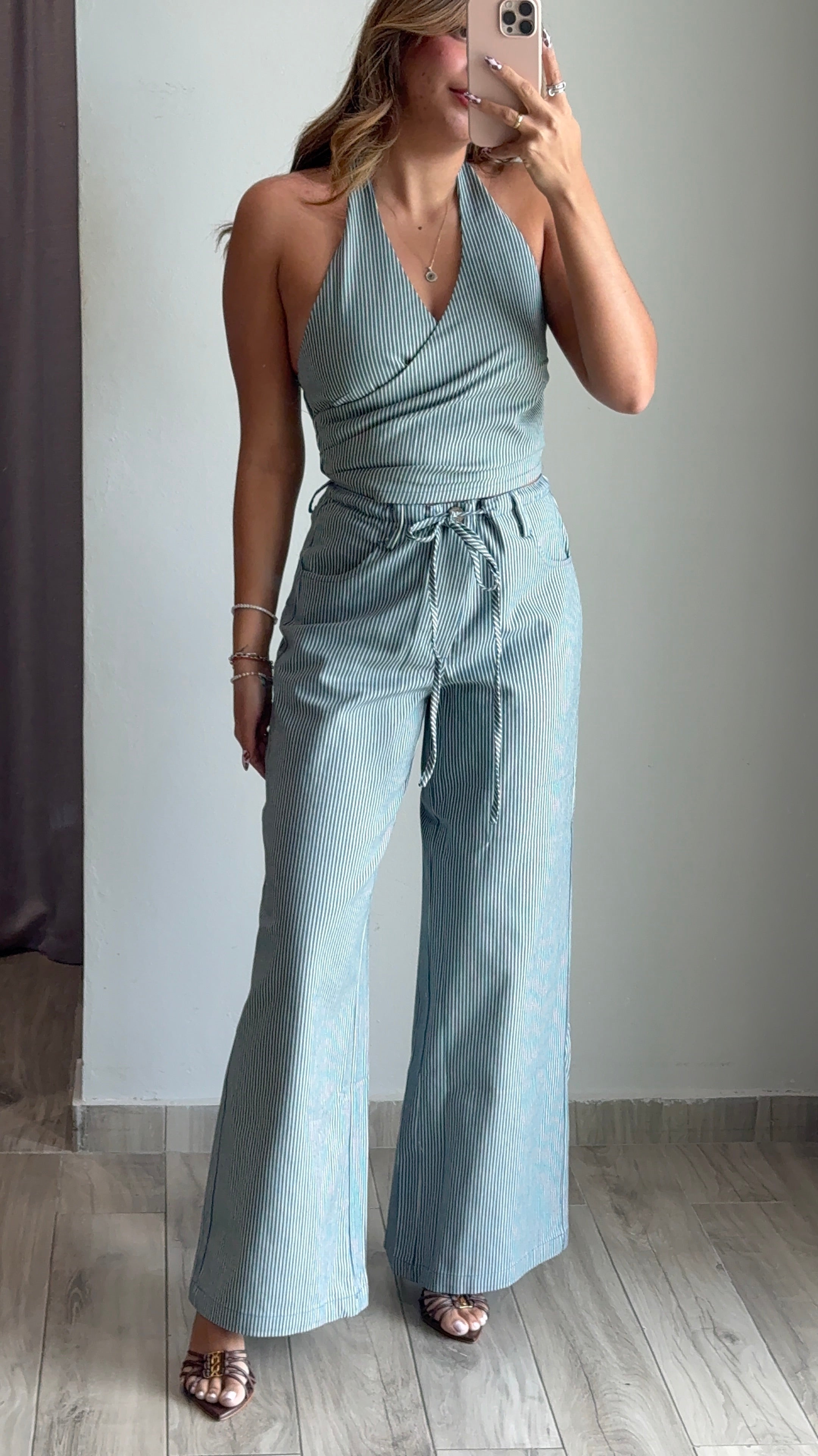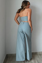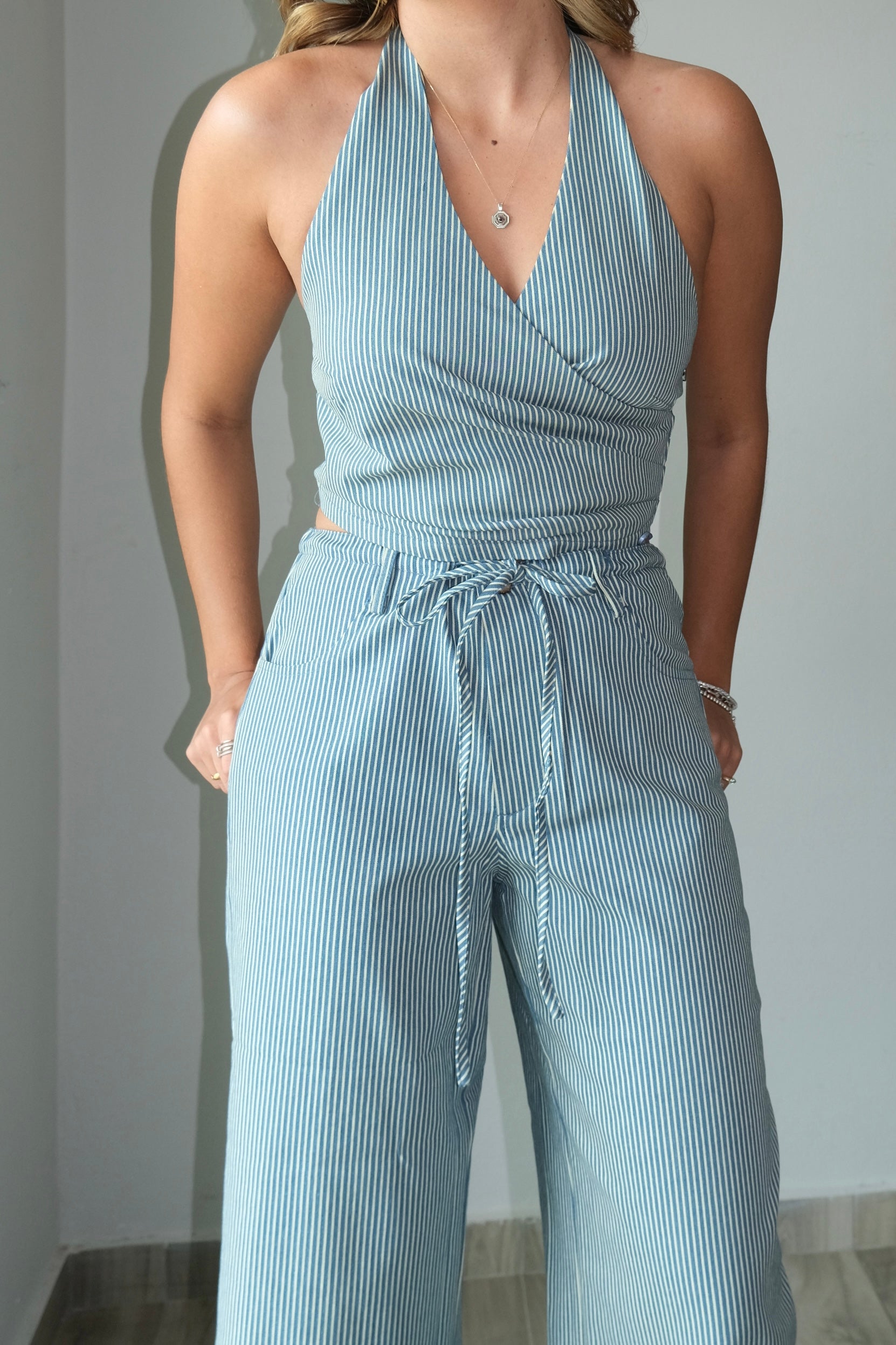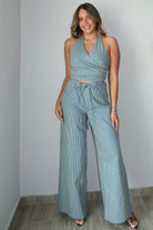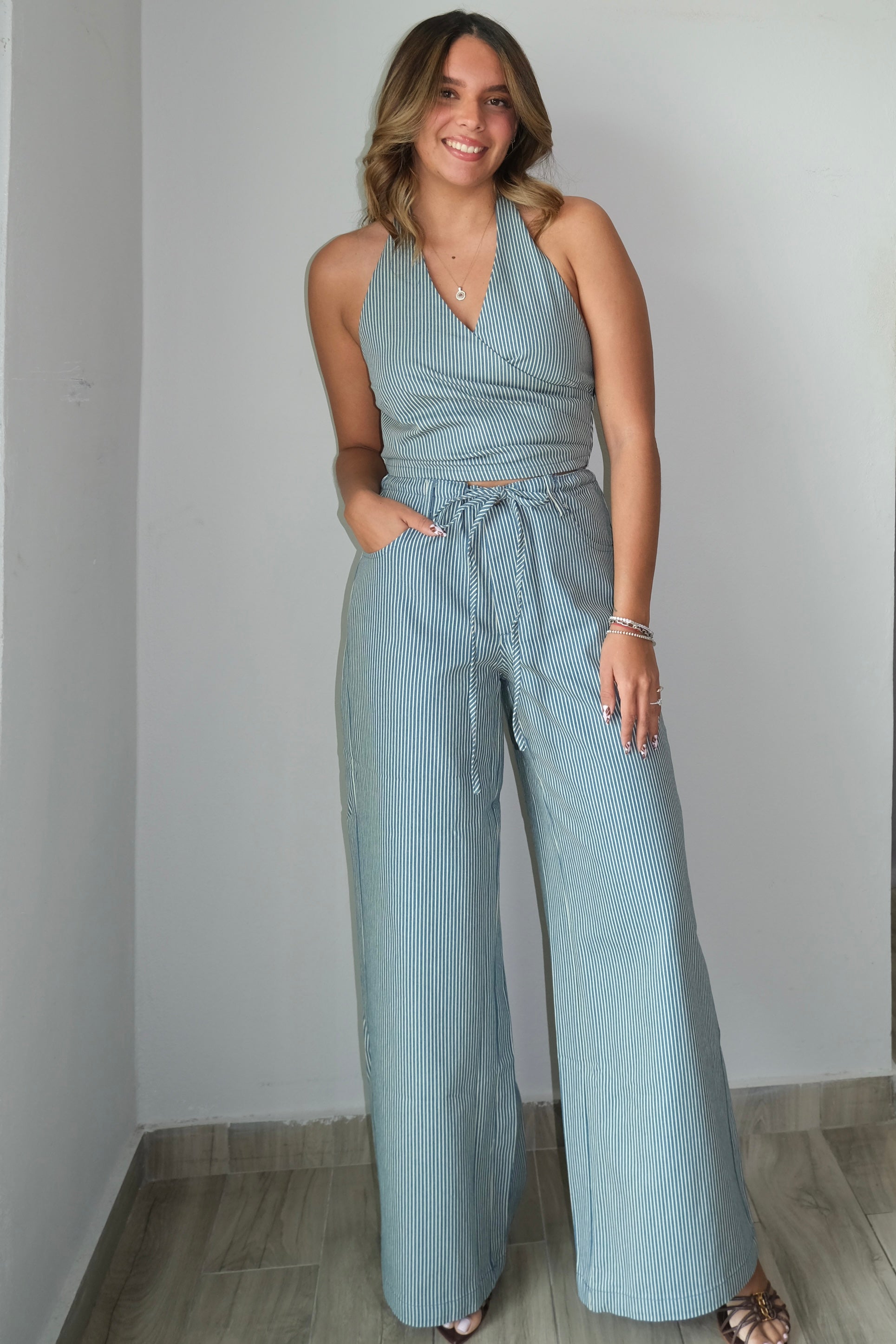 Effortless two-piece style with the Mabel Denim Striped Halter Top & Pant Set. The halter top features classic striped detailing and a flattering neckline, paired with matching denim pants for a coordinated look. Perfect for casual outings or dressed-up occasions. Runs true to size—our model wears a small. If you're between sizes, we recommend sizing up for optimal comfort and fit.