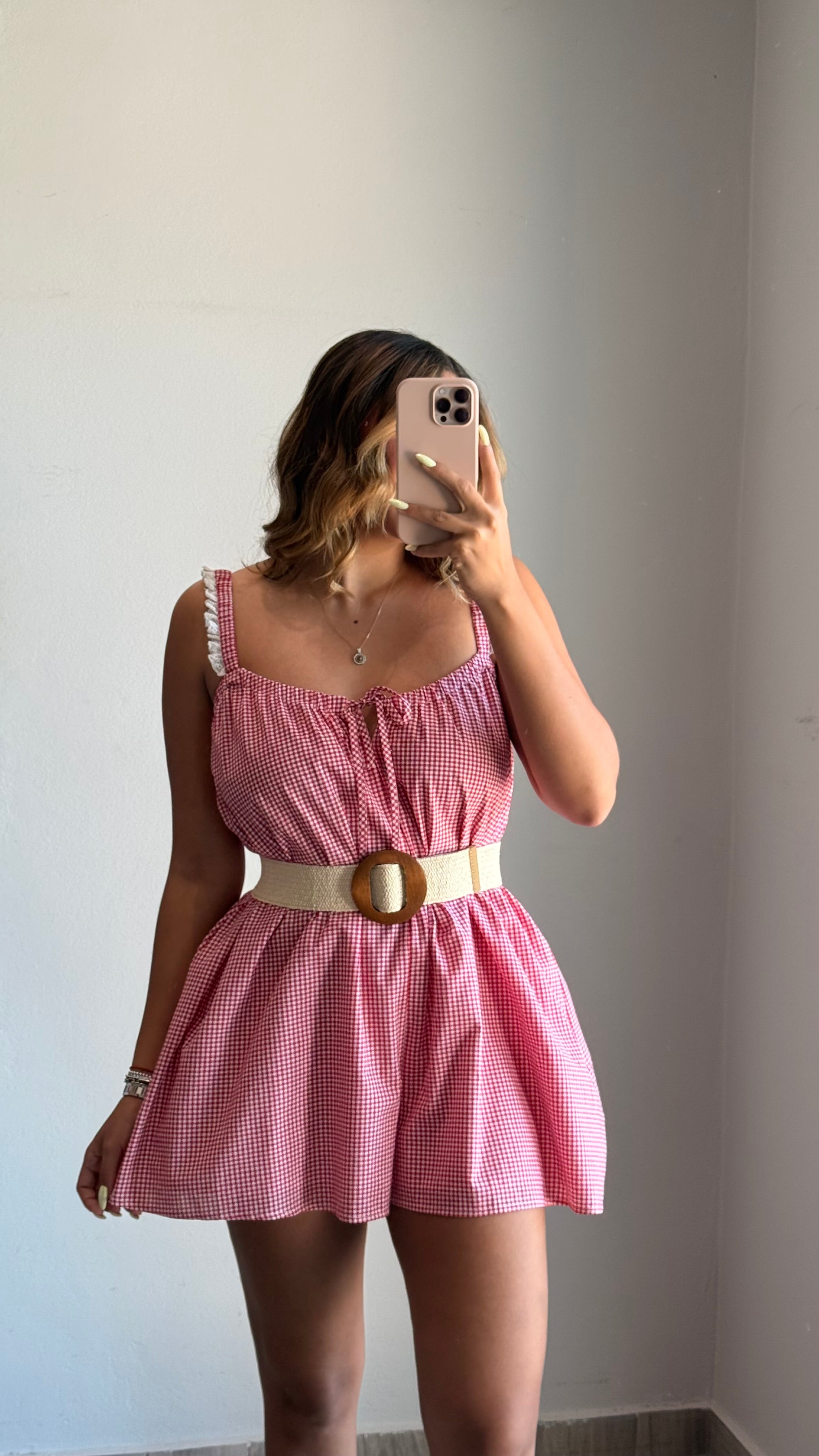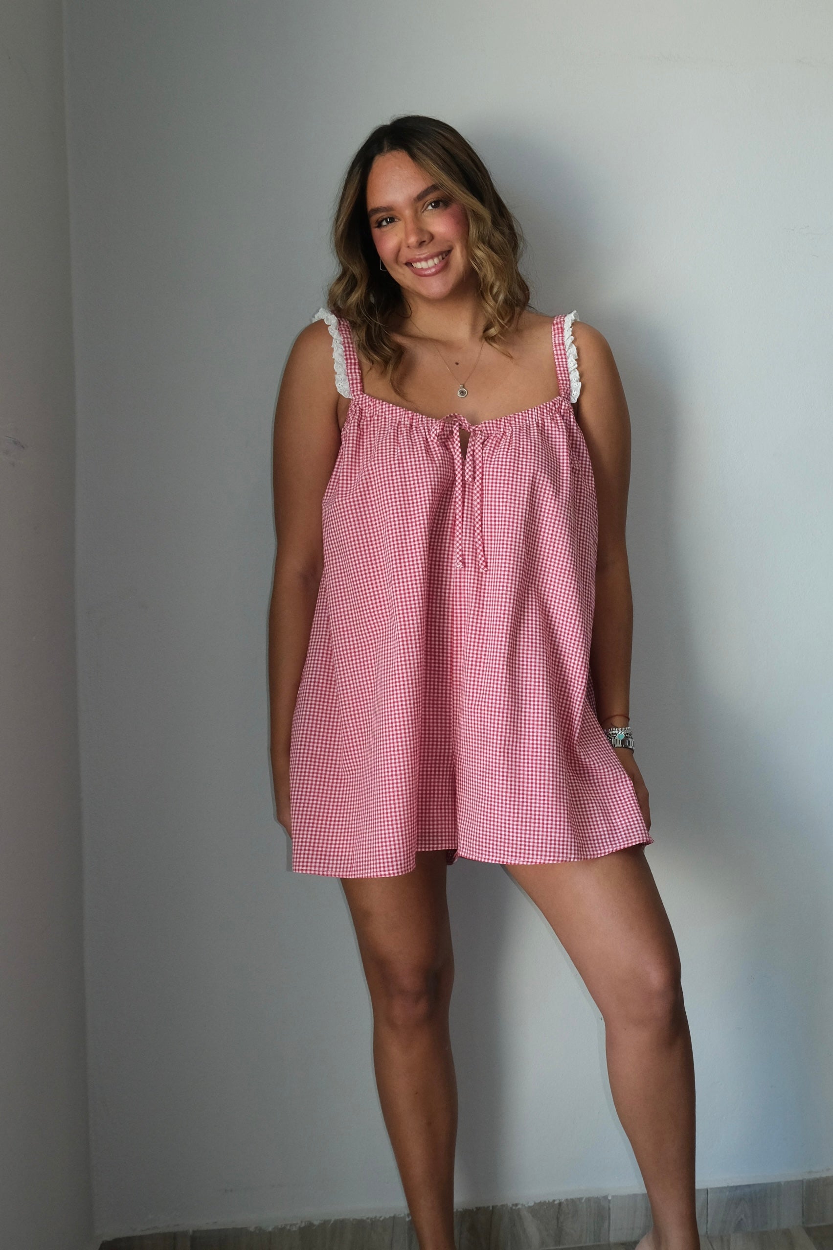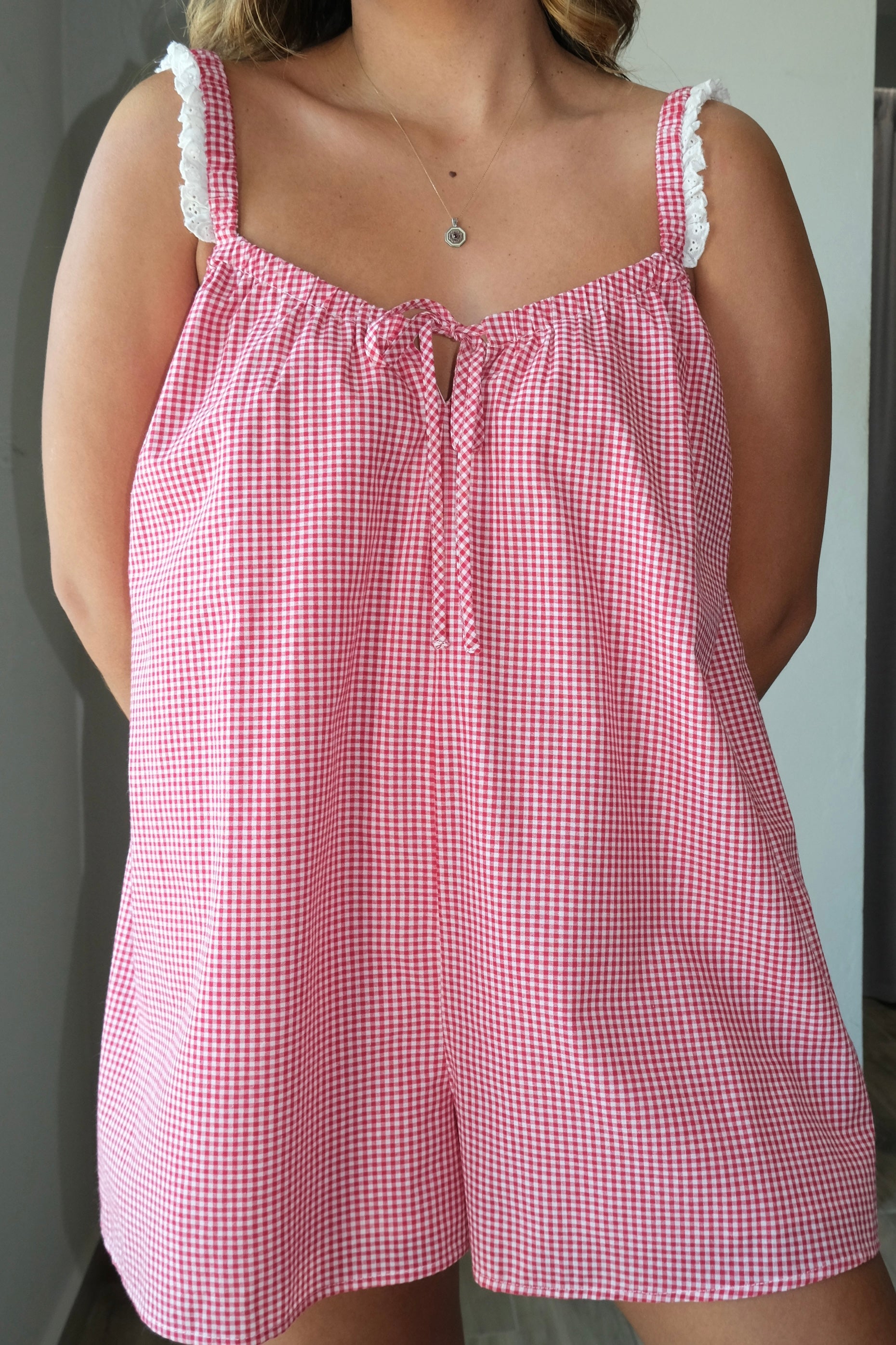 Mae Gingham Lace Trim Romper