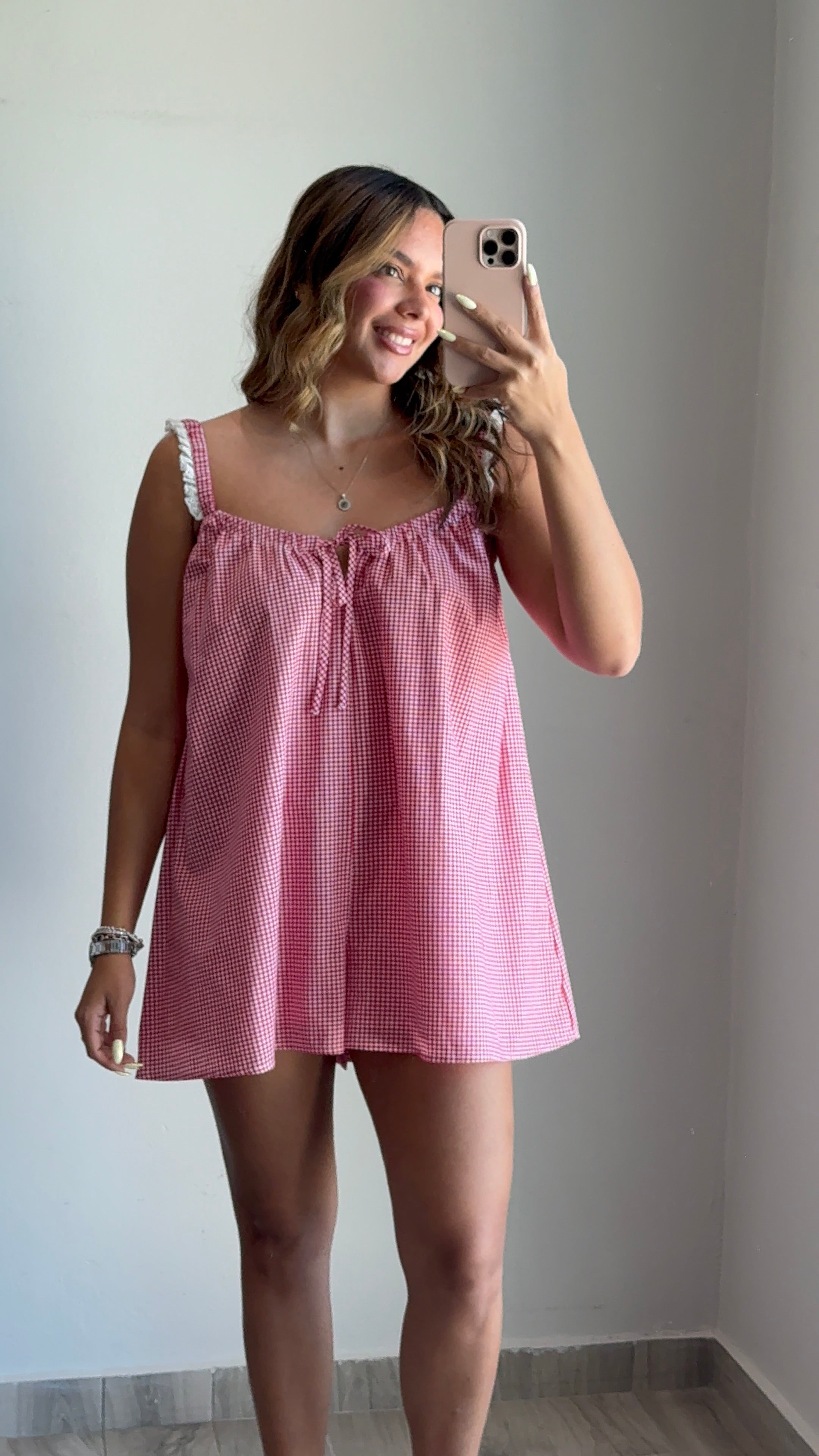 The Mae Gingham Lace Trim Romper offers a relaxed, comfortable fit that runs true to size. Modeled in a small with a loose silhouette, this piece works beautifully as-is or can be sized down for a more tailored look. Perfect for those who prefer an effortless, laid-back style with charming gingham and delicate lace trim details.