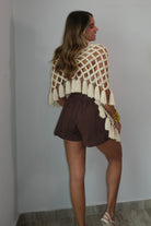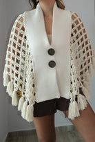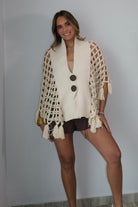 The Moira Macrame Knits Tessel Poncho features beautiful wood bottom details that add a natural, artisanal touch to this versatile piece. The intricate macrame knit design creates texture and visual interest, making it perfect for layering or wearing as a statement piece. True to size, this poncho offers a comfortable, relaxed fit. The model pictured wears a size small, giving you a reference for how it drapes and sits. Ideal for adding warmth and style to any outfit.