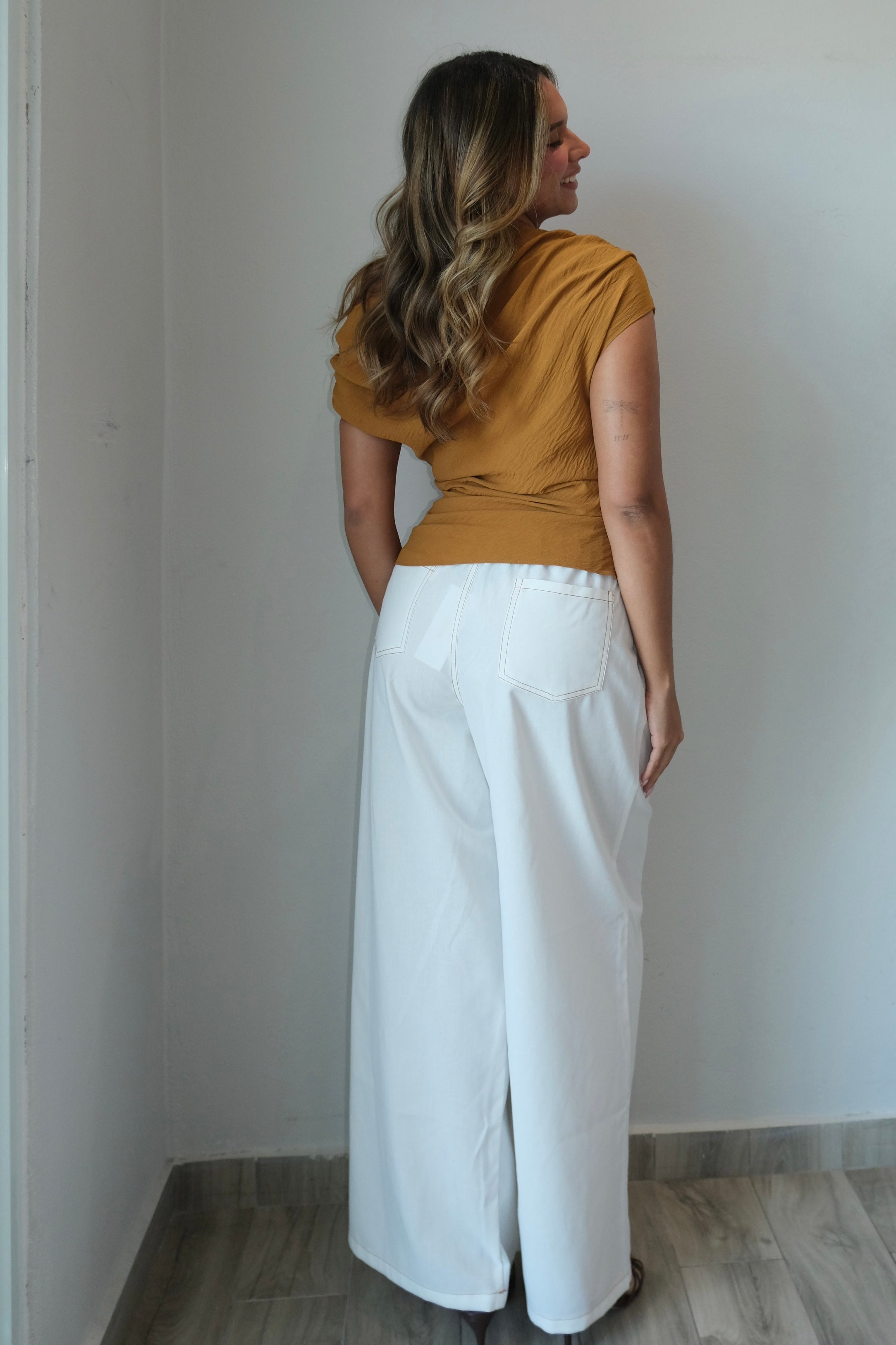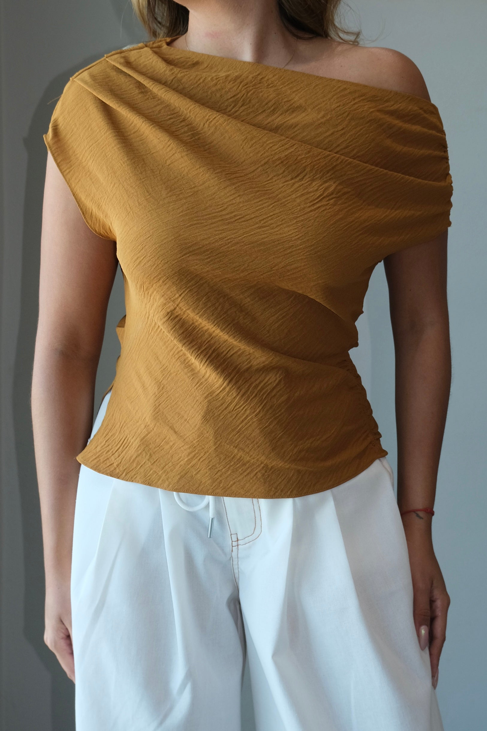 The Palmer Asymmetrical Draped Top features an elegant draped design that flatters the figure with its asymmetrical cut. This piece runs true to size, so choose your regular size for the perfect fit. If you're between sizes, we recommend sizing up for added comfort. The model pictured wears a small. Versatile and stylish, this top pairs easily with your favorite bottoms for a polished look.
