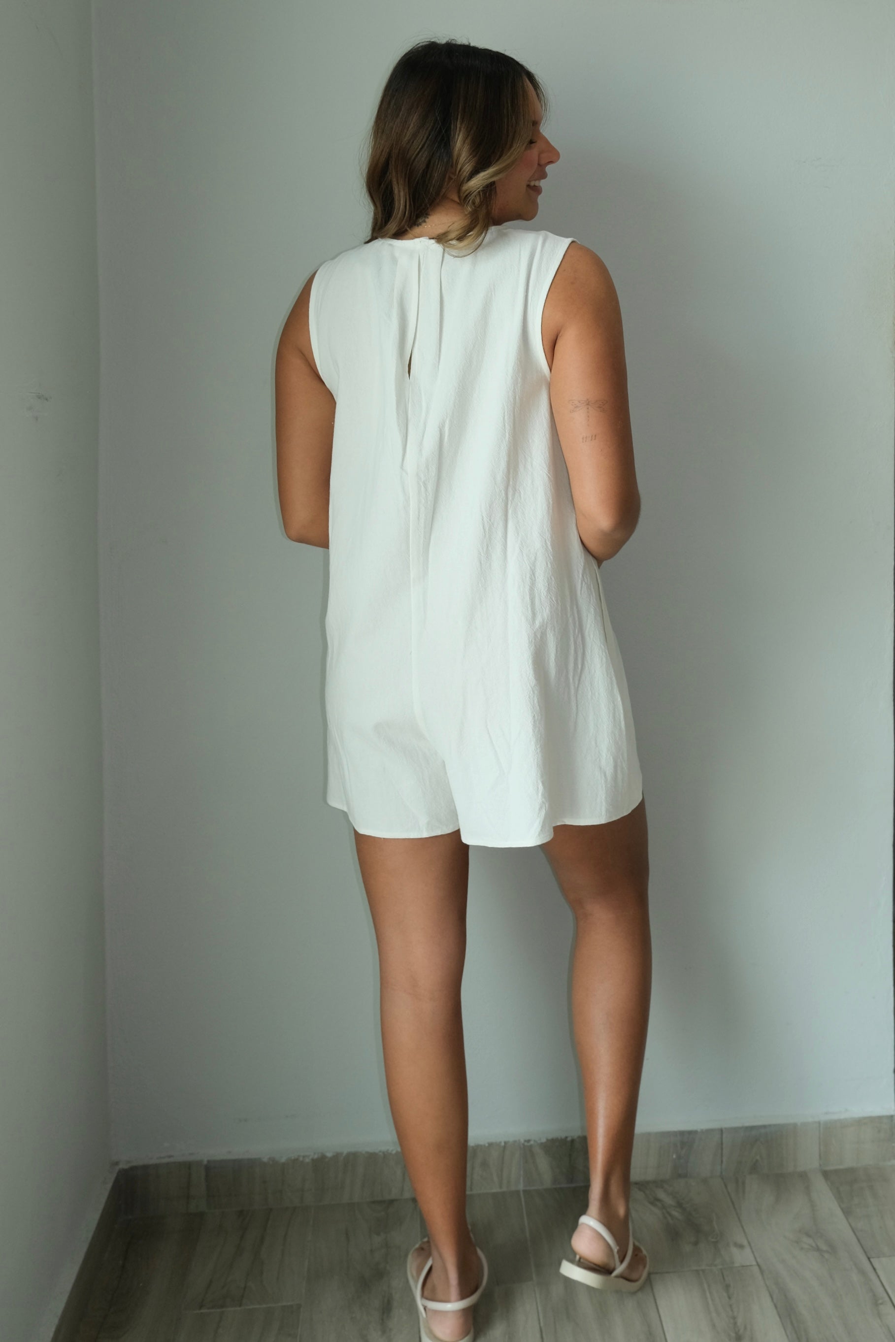 The Nola Tie Front Pleated Romper is a comfortable one-piece style made from 100% cotton. Features a charming tie front detail and pleated design for a flattering silhouette. Runs true to size—our model wears a small. Perfect for casual outings or relaxed days when you want effortless style and breathable comfort.
