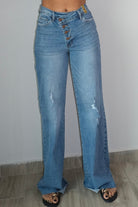 Nova Criss Cross High Waisted Wide Leg Jeans offer a flattering silhouette with their high waist and relaxed wide leg cut. Made from a soft blend of 99% cotton and 1% spandex, these jeans provide comfort and a bit of stretch for all-day wear. The criss cross detail adds a stylish touch to the front. They run true to size, so order your regular size. The model is wearing a size 3.