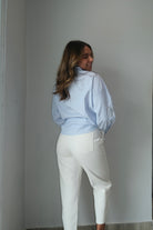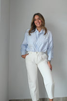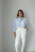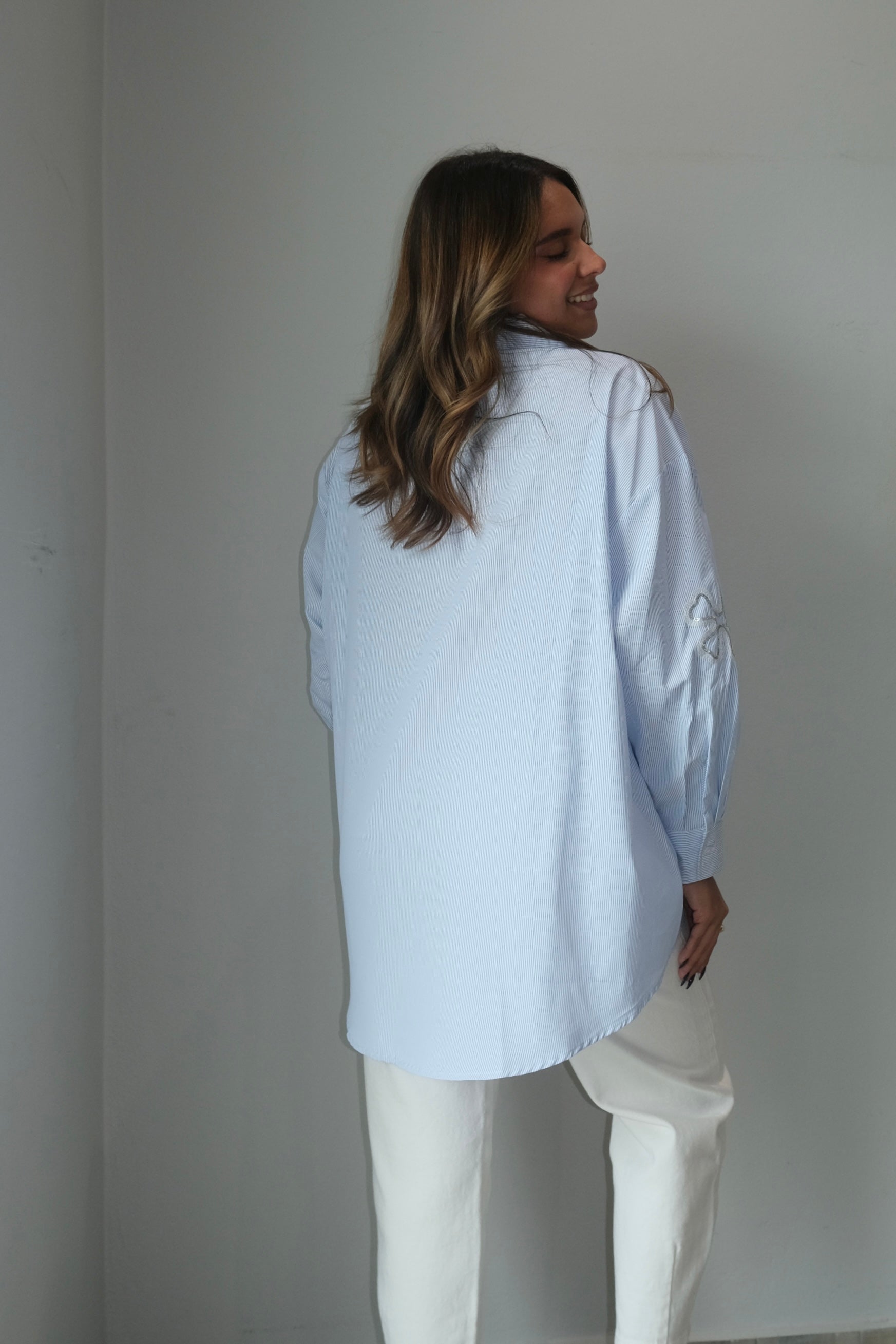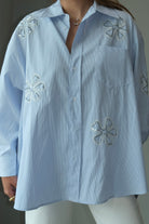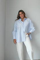 This Nova Sequin Striped & Button Down Blouse features a trendy oversized fit, providing both comfort and style. Made with high-quality materials, this blouse is perfect for any occasion. Enjoy the sophisticated look and feel of this versatile piece, as demonstrated by our model wearing a size small.