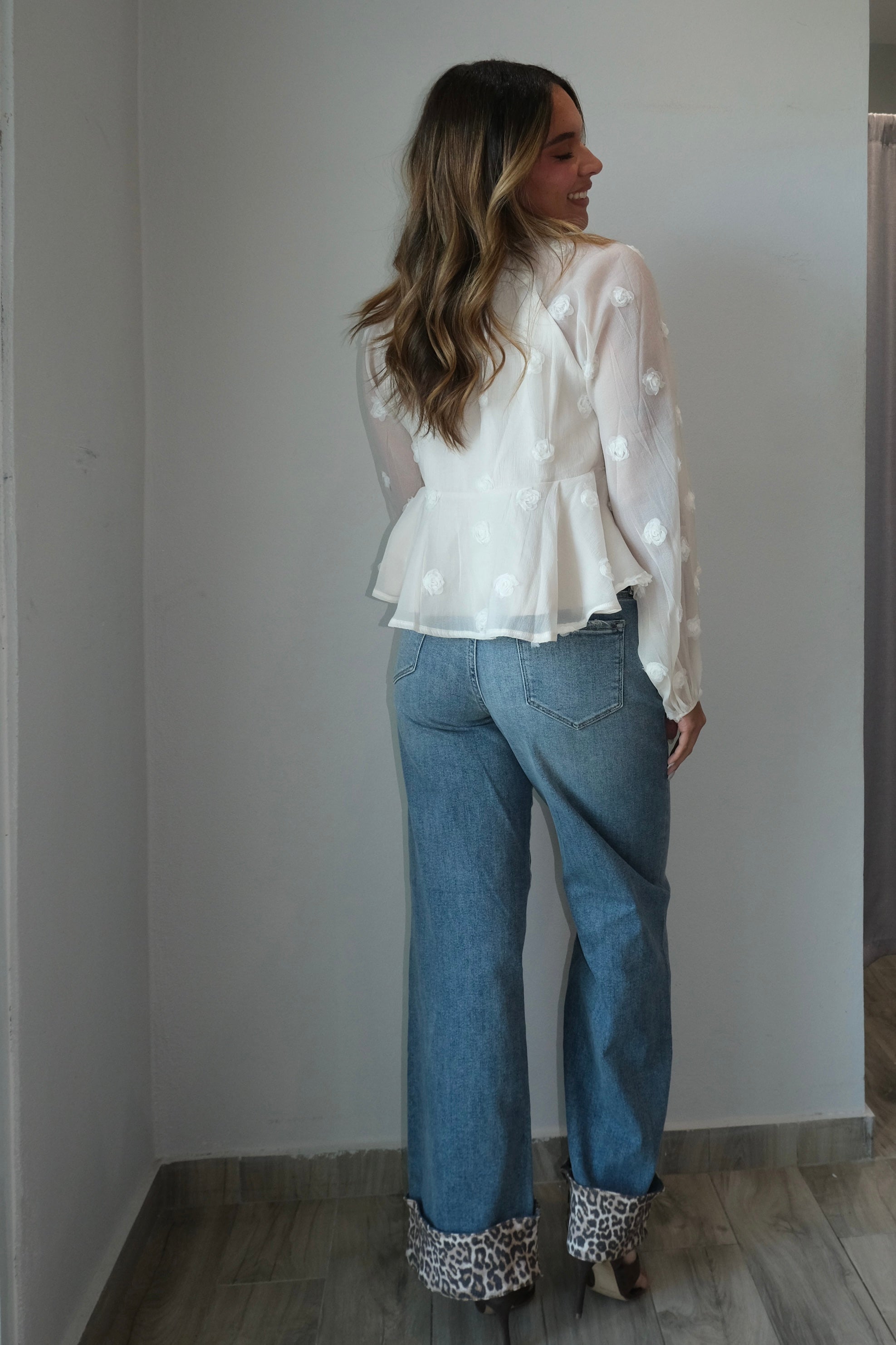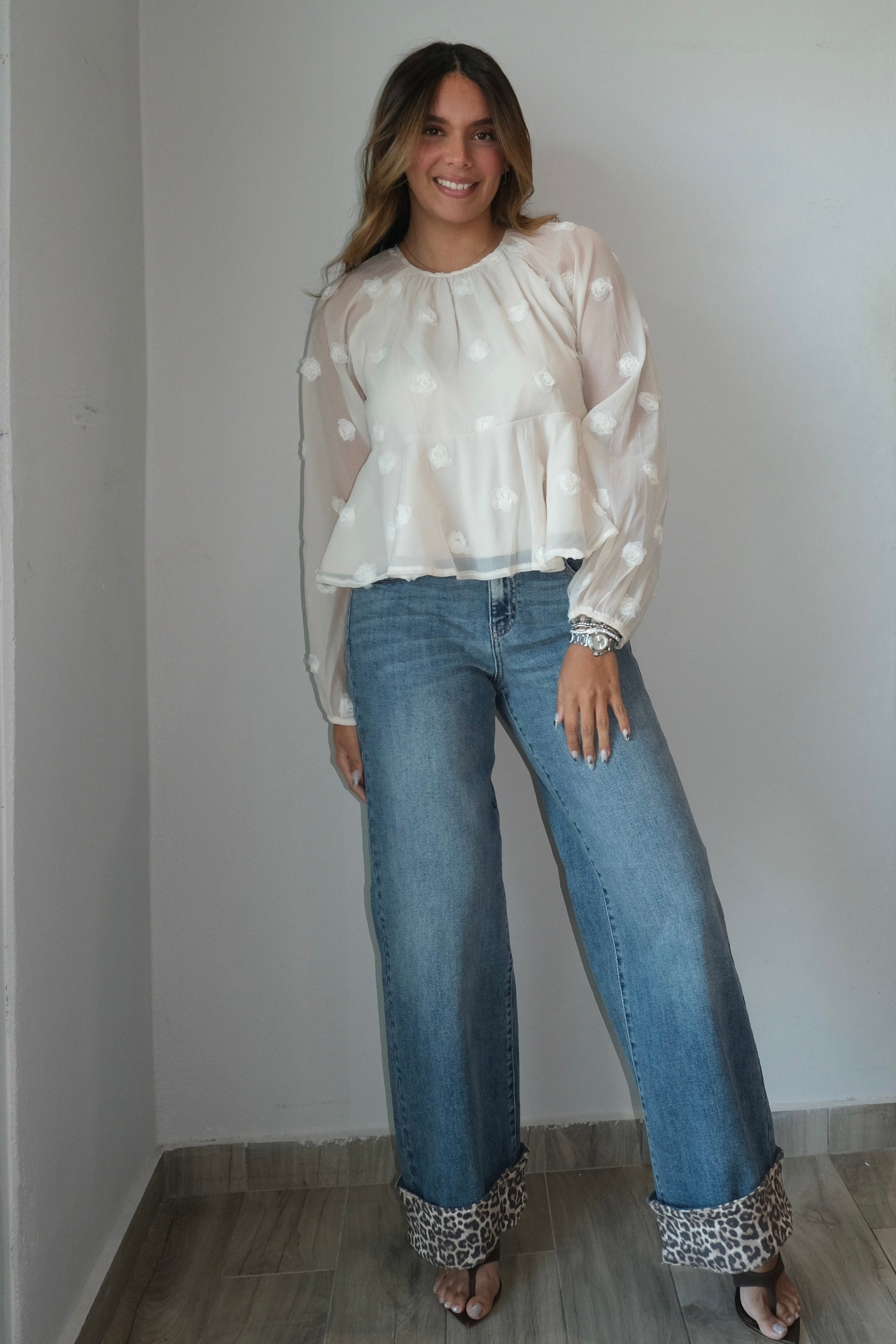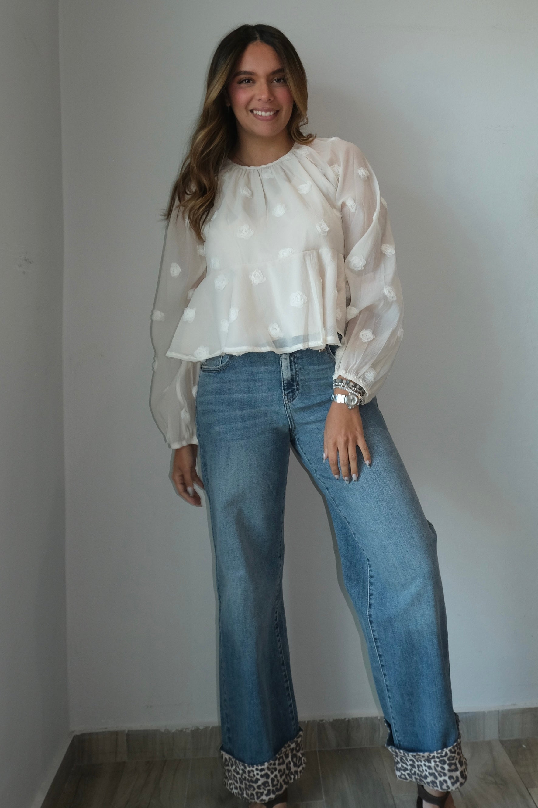 Rose Round Neck Mesh Blouse This delicate mesh blouse features an intricate 3D rose design that adds dimension and texture to your wardrobe. The round neckline offers a classic, flattering silhouette perfect for layering or wearing on its own. Note that this style runs large, so we recommend sizing down for the best fit. Our model wears a size small, which gives you a reference for how the blouse will look on your frame. The sheer mesh fabric creates an elegant, romantic look that works beautifully for both casual and dressed-up occasions.