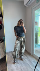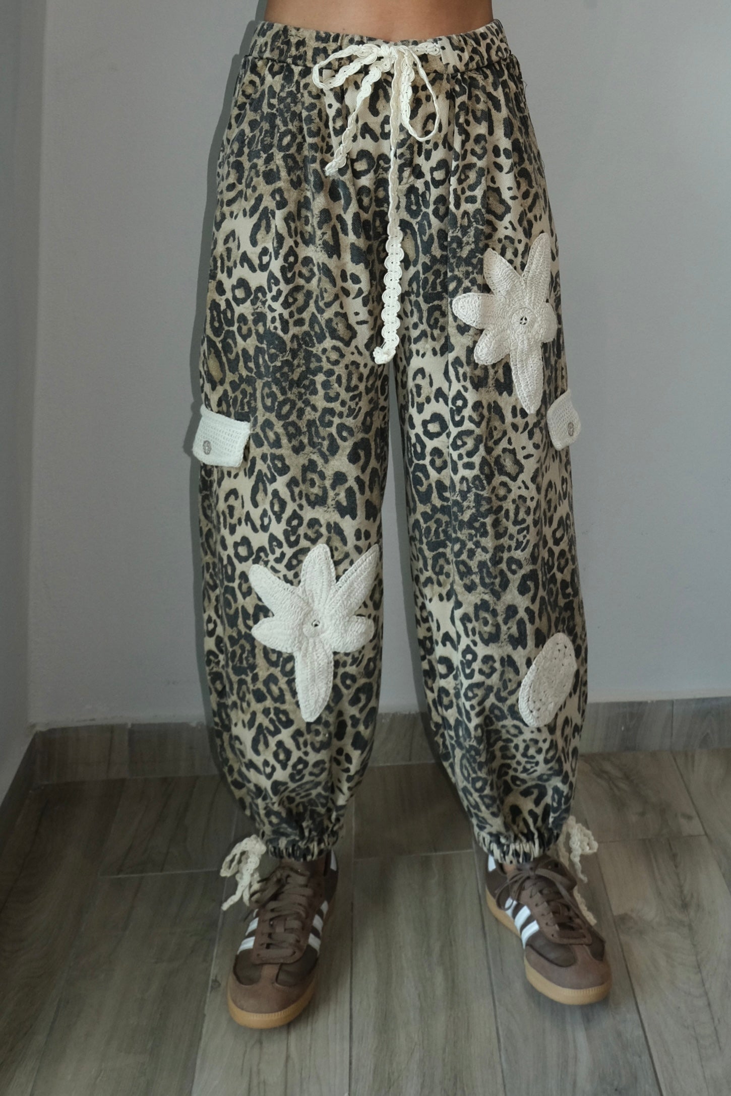 Sandy Leopard Boho Lace Cargo Pants in soft 100% cotton. This style runs true to size, though you can size down for a more fitted look. Model pictured wears a small. Perfect for effortless, relaxed days with a touch of bohemian flair.