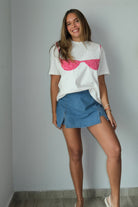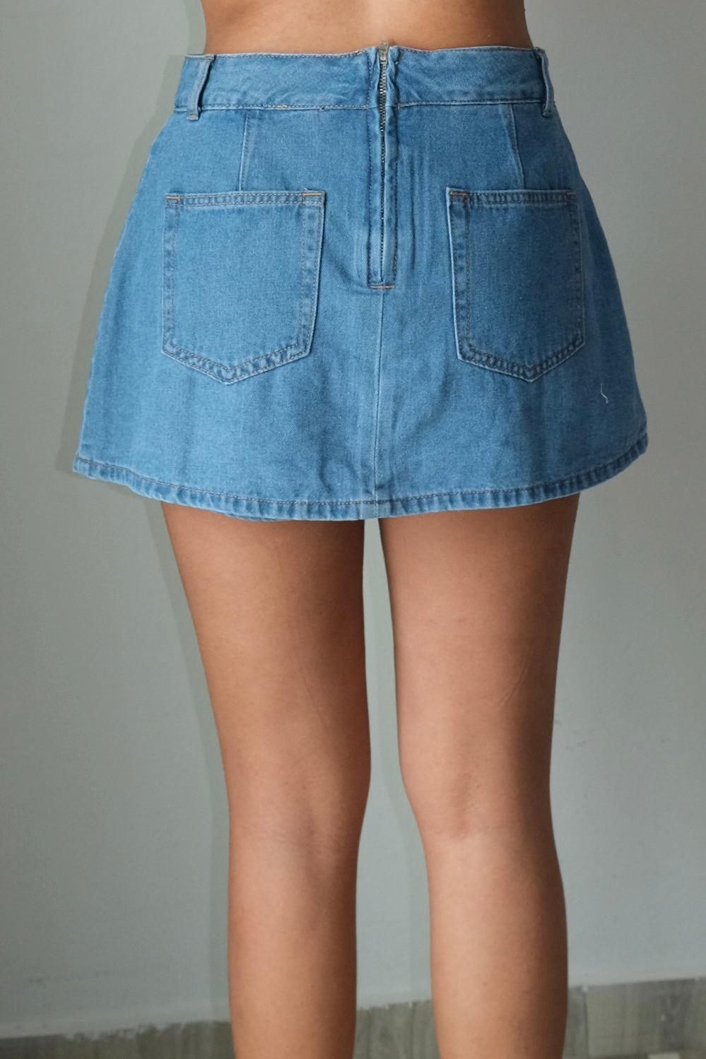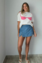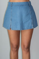 The Selene Front Slit Denim Skort is made from 100% rayon for a soft, breathable feel. This piece runs true to size, so choose your regular size for the best fit. If you're between sizes, we recommend sizing up for extra comfort. The model is wearing a size small. Perfect for effortless style with practical movement.