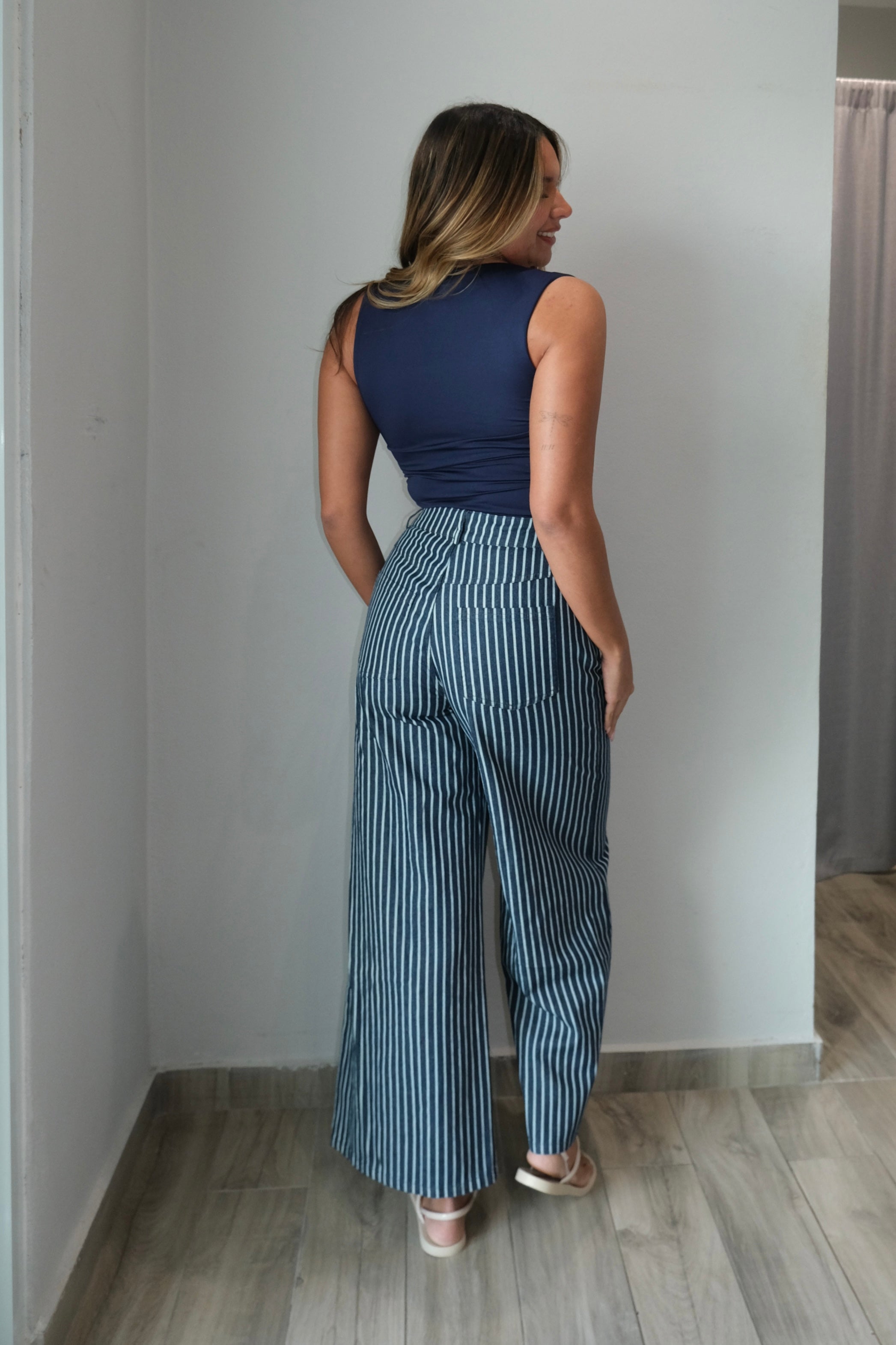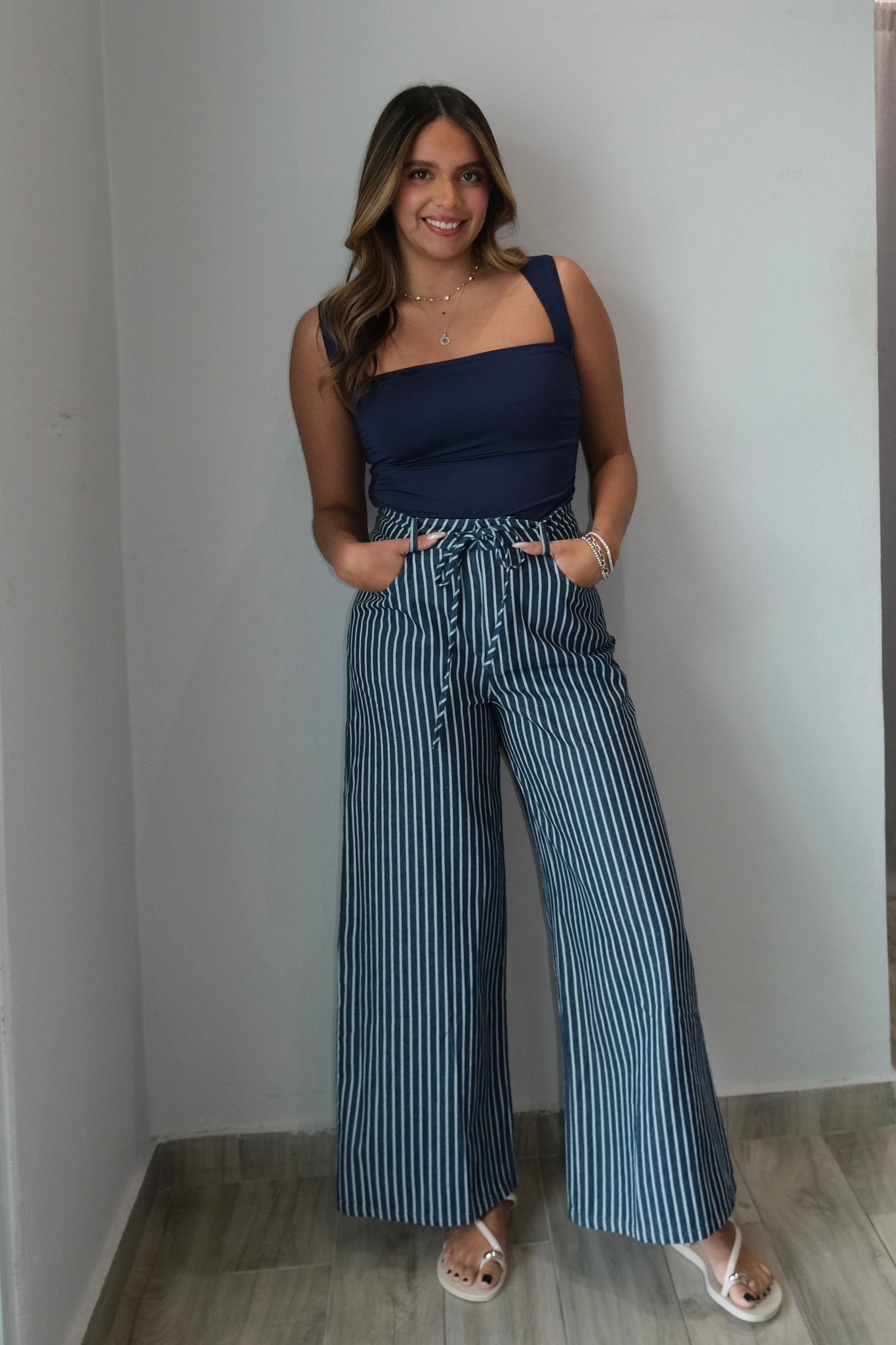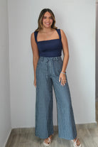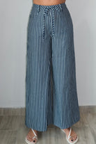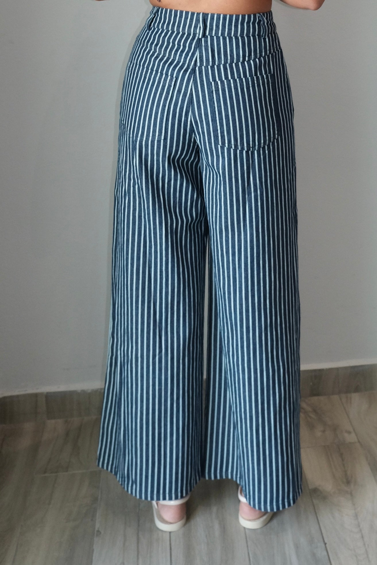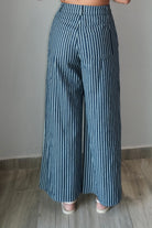 Stella Striped Wide Leg Pants in a relaxed, comfortable fit. Made from 100% cotton for breathability and durability. These pants run true to size. The model is wearing a size small. Important: these pants do not stretch, so if you're between sizes, we recommend going up a size for the best fit. Perfect for casual styling with their classic striped pattern and flattering wide leg silhouette.