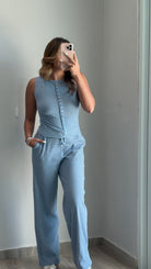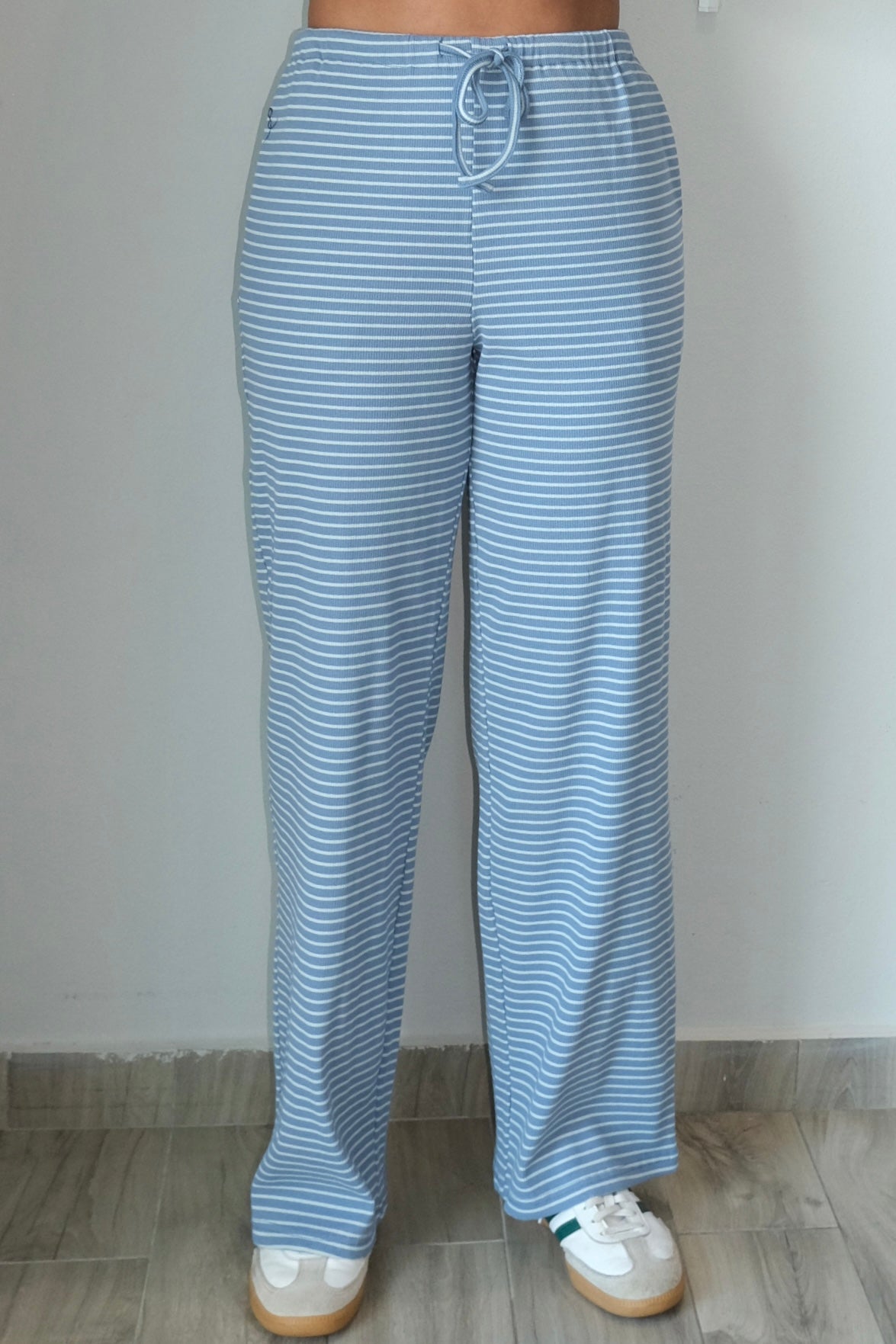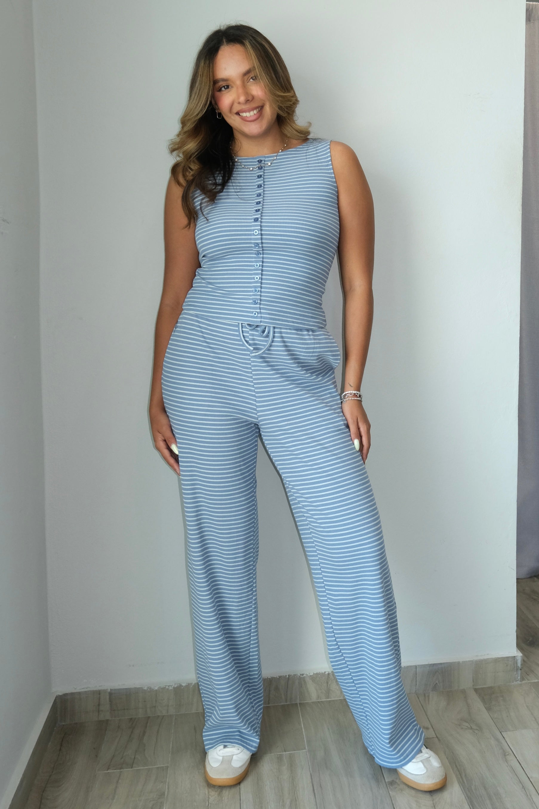 Talula Striped Button Top & Pants Set runs true to size. Model pictured wears a small. Crafted from a comfortable cotton-spandex blend—95% cotton, 5% spandex—for a structured yet flexible fit that moves with you. Perfect for resort wear or everyday styling.