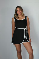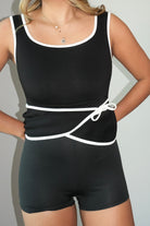 Thalia Scuba Contrast Trim Romper Effortless style meets comfort in this scuba romper featuring striking contrast trim details. The structured fabric provides a flattering silhouette while the soft lining ensures all-day wearability. Crafted from a breathable polyester and rayon blend with spandex stretch, this piece moves with you. Runs true to size. Model pictured wears size small.