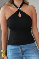The Victoria Gold Detailed Knit Halter Top features a luxe blend of 50% viscose, 29% polyester, and 21% nylon for a soft, comfortable fit. The halter neckline adds a touch of elegance to this versatile piece. This top runs true to size, so choose your regular size for the perfect fit. The model is wearing a small. Pair it with your favorite bottoms for an effortless, polished look.