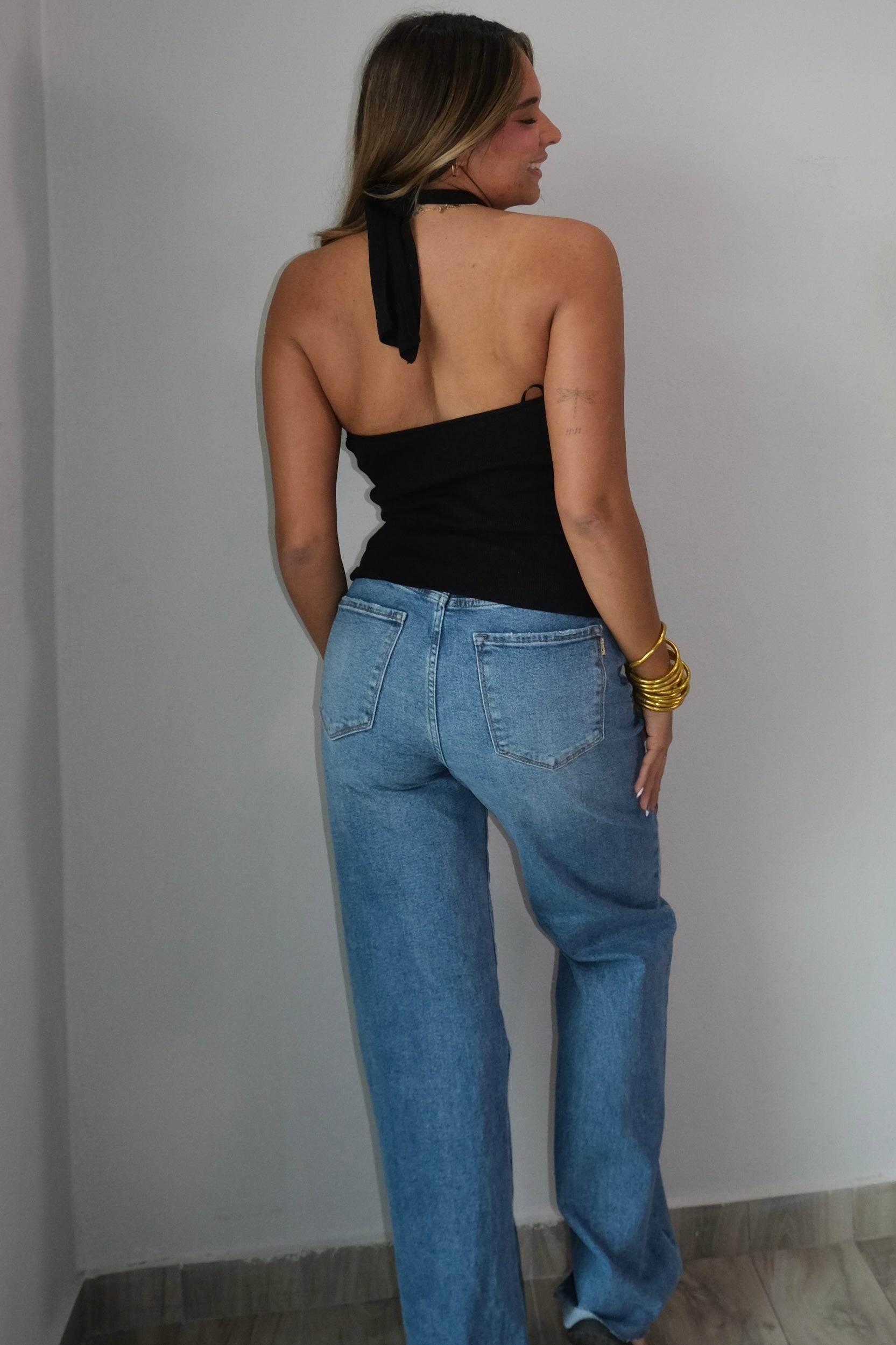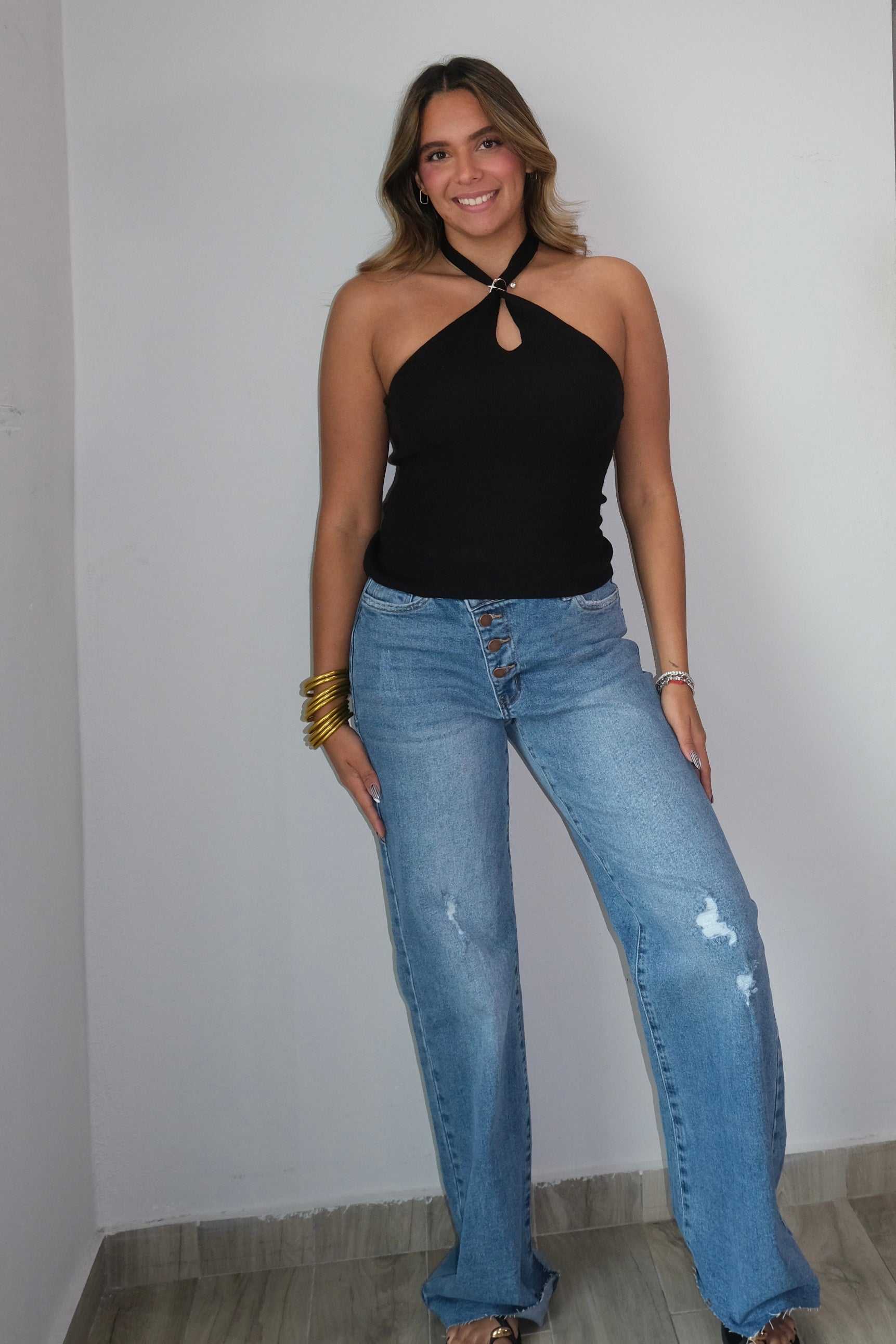 The Victoria Gold Detailed Knit Halter Top features a luxe blend of 50% viscose, 29% polyester, and 21% nylon for a soft, comfortable fit. The halter neckline adds a touch of elegance to this versatile piece. This top runs true to size, so choose your regular size for the perfect fit. The model is wearing a small. Pair it with your favorite bottoms for an effortless, polished look.