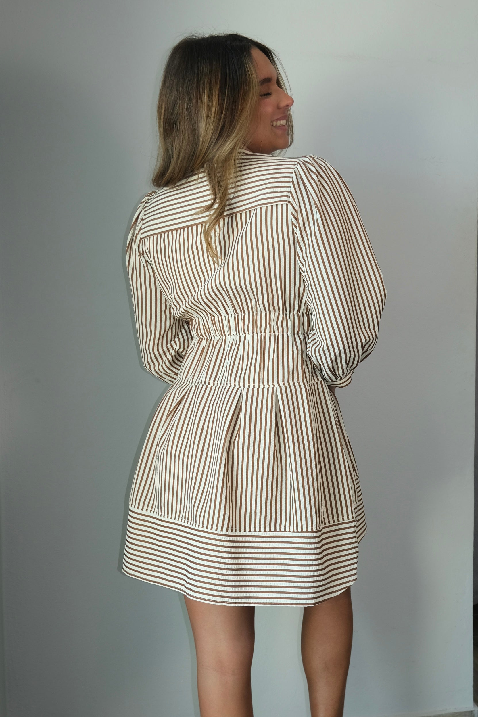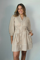 The Madeline Striped Down Dress combines timeless striped detailing with the warmth and lightweight comfort of down insulation. Cut to run true to size, this dress offers a flattering silhouette that transitions seamlessly from season to season. The model pictured wears a size small, providing a clear reference for fit. Perfect for layering or wearing solo, this piece delivers both style and practical warmth for the modern wardrobe.