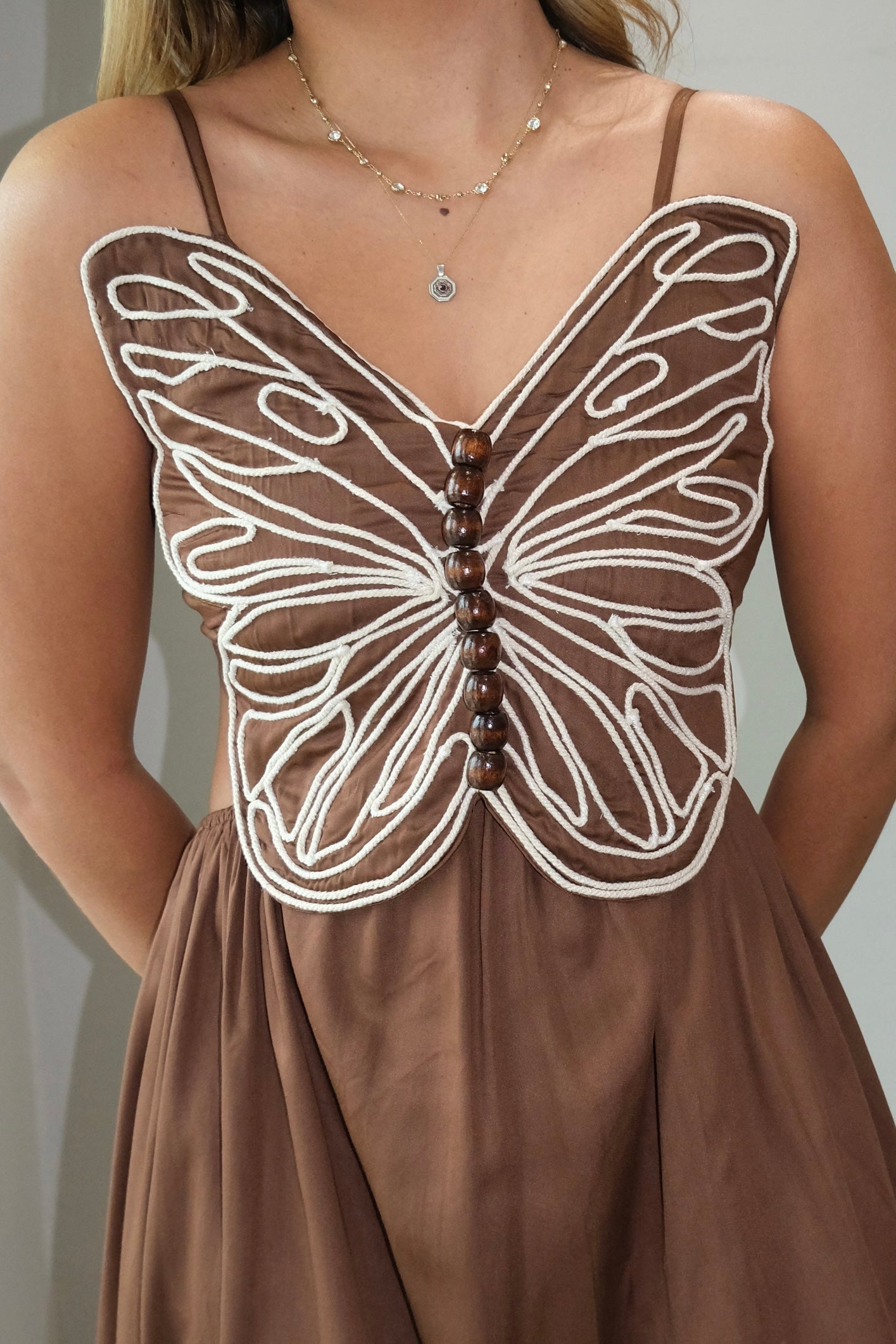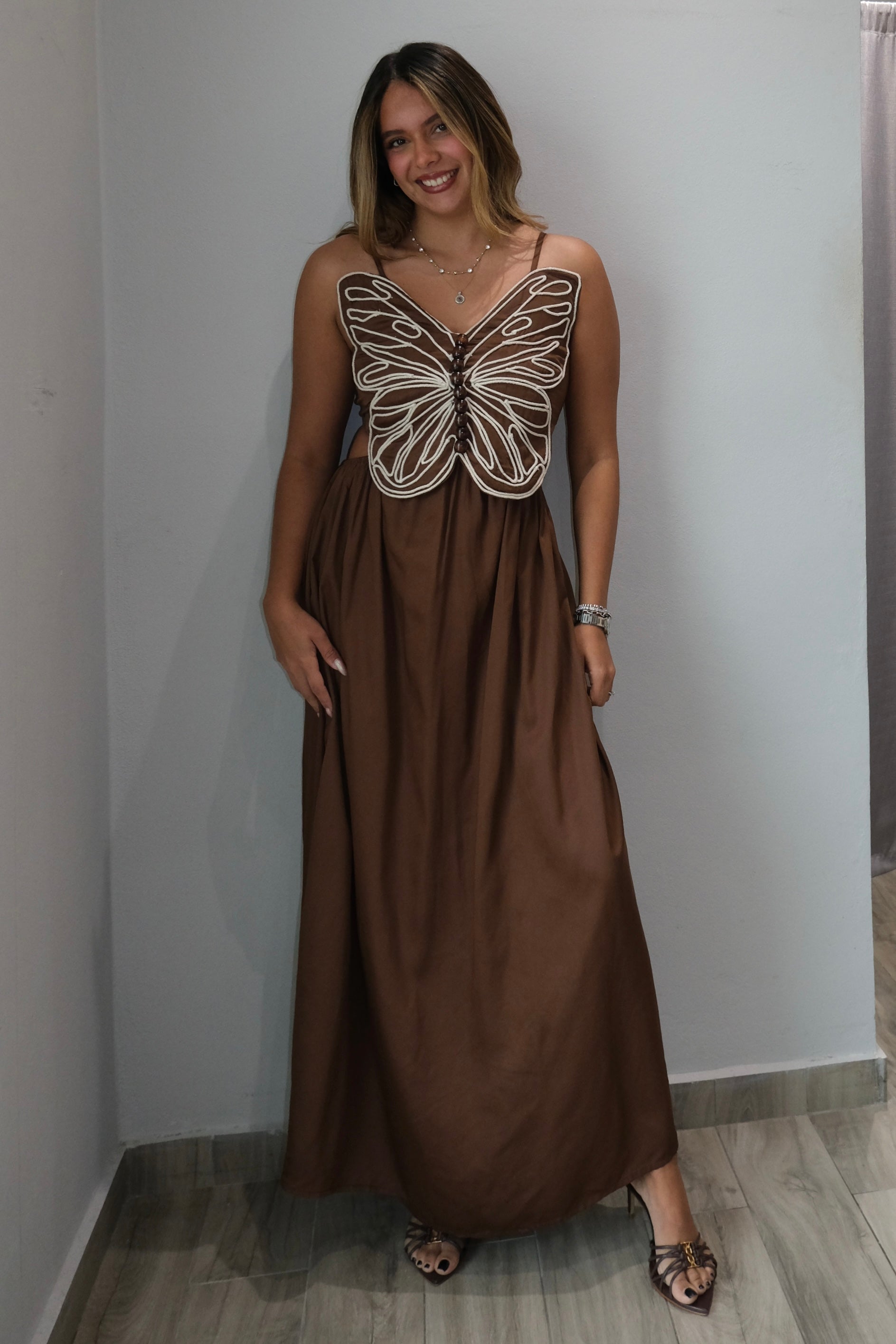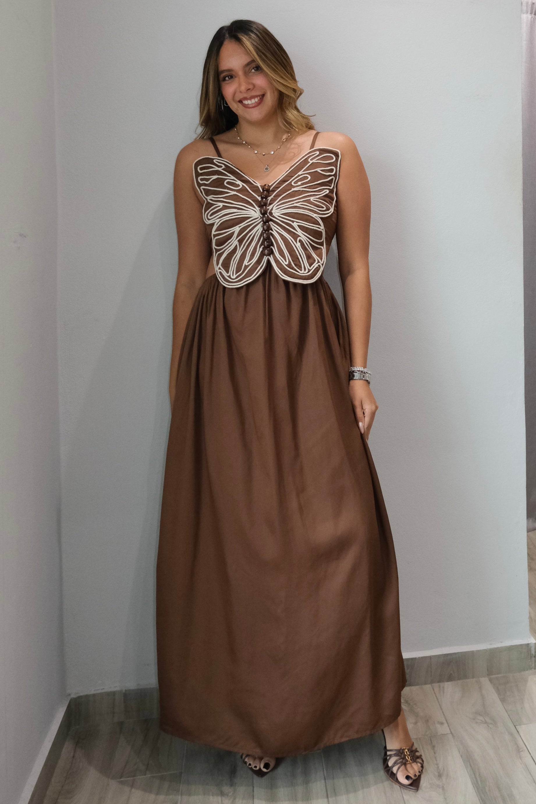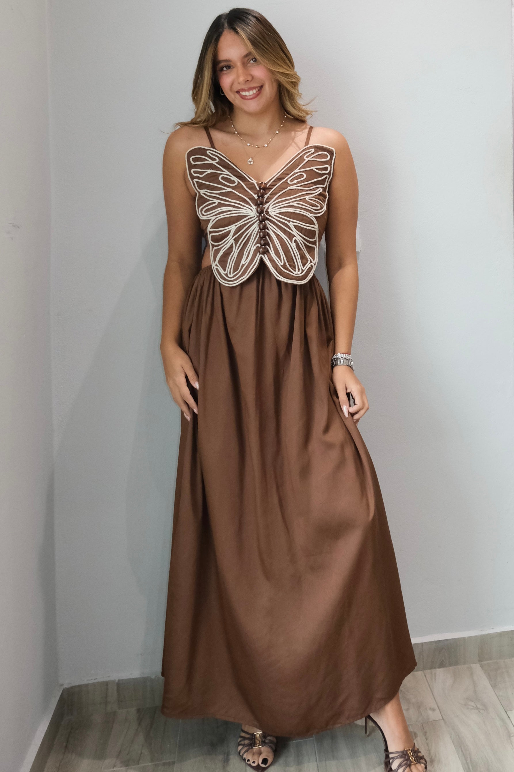 Nia Wood Details Embellished Butterfly Dress This stunning maxi dress features delicate butterfly panel detailing at the front that catches the eye with every step. The adjustable shoulder straps allow you to customize your fit for maximum comfort, while the smocked panel at the center back adds elegant texture and dimension. An elasticated waistband provides flexibility throughout the day, moving with your body for ease and comfort. The dress runs true to size, with our model wearing a small. Perfect for special occasions or elevated everyday wear, this piece combines intricate embellishments with thoughtful construction for a dress that looks as good as it feels.