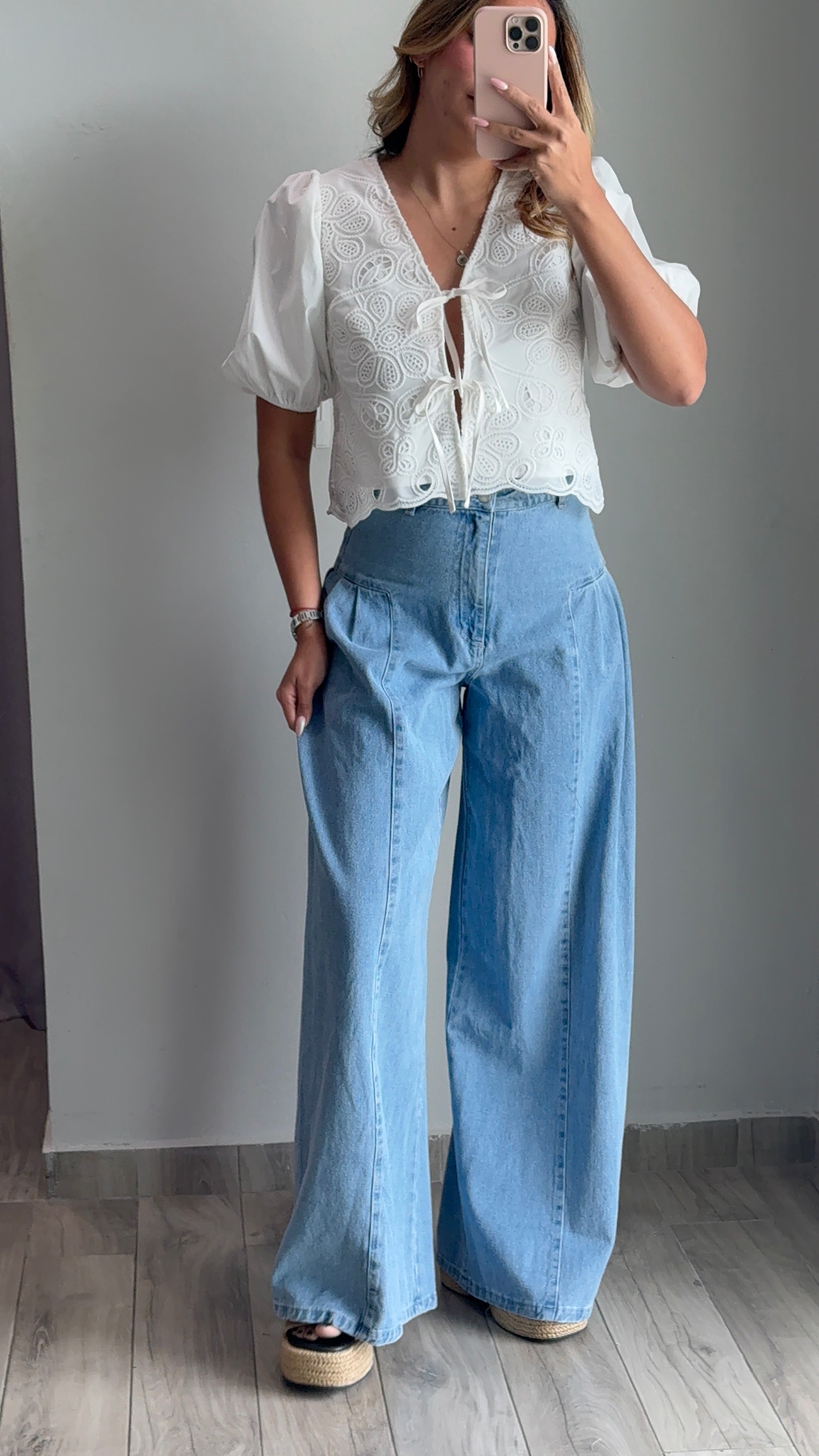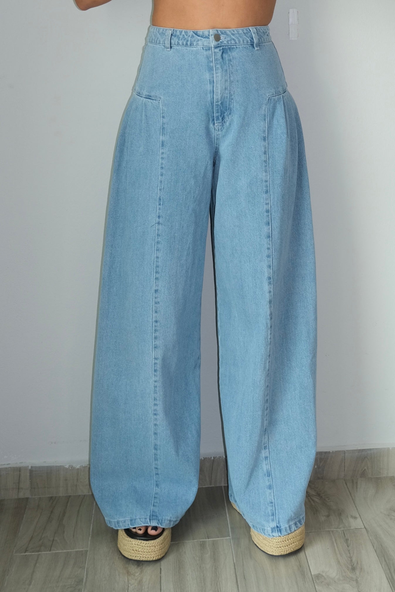 Rue Denim Pleated Flare Wide Leg Jeans feature a classic silhouette with structured pleats and a flowing wide leg cut. These jeans run true to size, though the waist area does not stretch, so consider sizing up if you need extra room at the waist. The model wears a size small. Perfect for creating effortless, vintage-inspired looks with timeless style.
